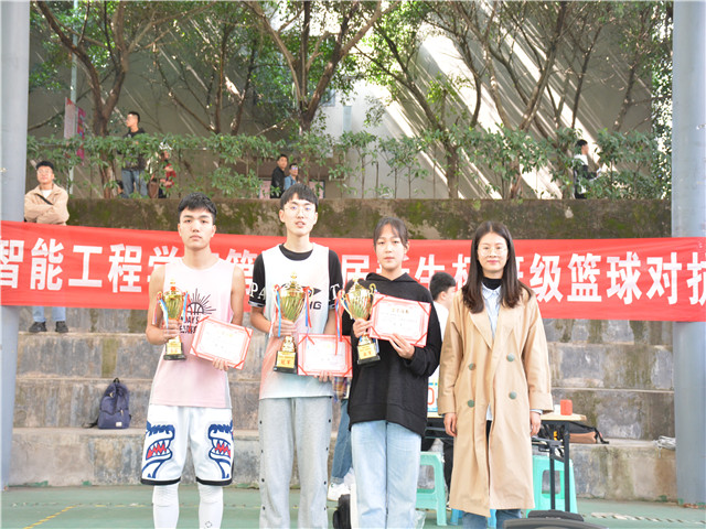 10月23日“新生杯”颁奖仪式在风雨球场举行,智能工程学院副院长李巧、团委书记郭菲、体育协会指导老师孙良顺、粟丹以及辅导员毛玲、蓝剑锋参加本次颁奖仪式,并为“新生杯”冠亚季军颁发了奖杯,为“新生杯”篮球赛MVP球员颁发了奖状。之后,郭菲老师面对此次“新生杯”篮球赛有感而发,“新生杯”篮球赛组织安排有序,同学们热情文明,裁判公正准确。她强调,此次篮球队增强了同学们的友谊,增加班级之间的交流,提高班级凝聚力,也感谢赛事组织者、裁判员对篮球赛的辛苦付出。李巧副院长对智能工程学院竞技体育的发展进行了发言。她指出智能工程学院正在打造体育标杆院系,通过“新生杯”篮球赛,做到竞技式育人,培养学生自信坚韧的心态,促进学生体质发展,做到选拔篮球人才,推动院队梯队化建设。