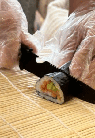 然后,学生们分组开始动手制作美味的寿司和紫菜卷。在这个过程中,他们不仅展现了团队合作的精神,还尝试各种大胆的搭配方式。有人放了太多油,有人放了太多盐,但大家都在努力尝试,享受着亲手制作美食的乐趣。