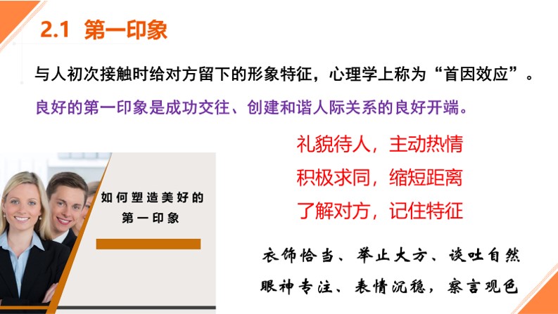 “当你相亲的时候,会在意对方的哪些方面?第一眼看什么?其次看什么?”同学们答道:“看脸、看谈吐、看三观……”向老师用心理学上的“首因效应”强调第一印象在人际交往中的重要性。第一印象不仅看“颜值”,还要看“言值”。本•琼森说过:“语言最能暴露一个人,只要你说话,我就能了解你。”一个人读过的书,走过的路,见过的人,都藏在他的语言里。