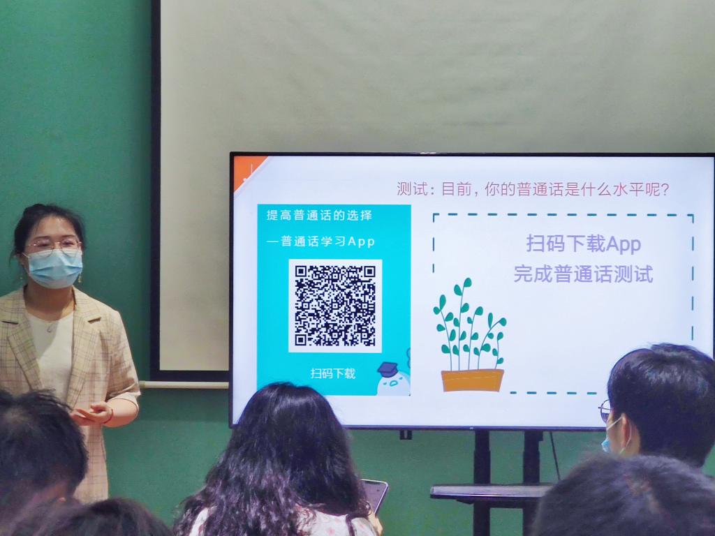 最后,向老师请大家扫码下载普通话学习APP进行测试,了解自己的普通话水平,并鼓励大家,要想练好表达能力,就一定要先练习普通话,攻克顽固方言、平翘舌音等问题。向老师向同学们推荐了一个练习口语表达的方法:拍摄视频日记。只要每天练习,拍出一个语言流畅的vlog,或面对镜头语言丰富且流利地描述一个事或物,坚持21天,一定能够看到自己的改变。