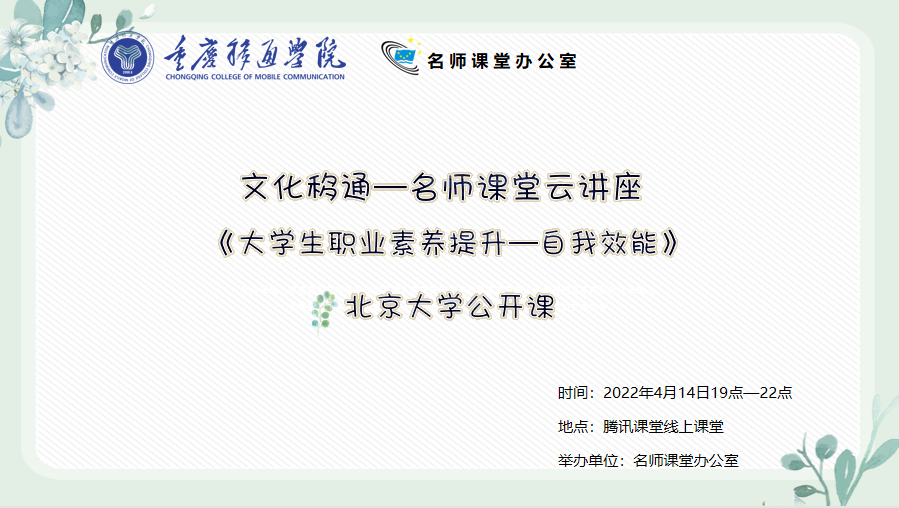 4月14日晚7点,“文化移通云课堂”播放了北京大学庄明科老师的公开课《大学生职业素养提升——有效沟通与自信演讲》,为同学们提供提升语言能力的各种技巧。