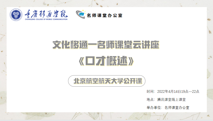沟通靠会说话的嘴巴和会听话的耳朵,会说话的嘴巴就是口才。口才是有效的用艺术的手法去表达自己的真情实感,一句话使人笑,一句话使人跳。4月14日晚7点,“文化移通云课堂”播放了北京航空航天大学姚小玲老师的公开课《演讲与口才》,带领我们探索语言的奥秘。
