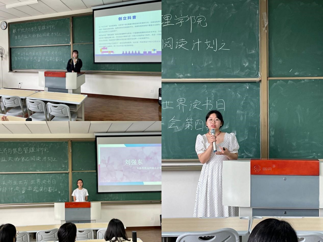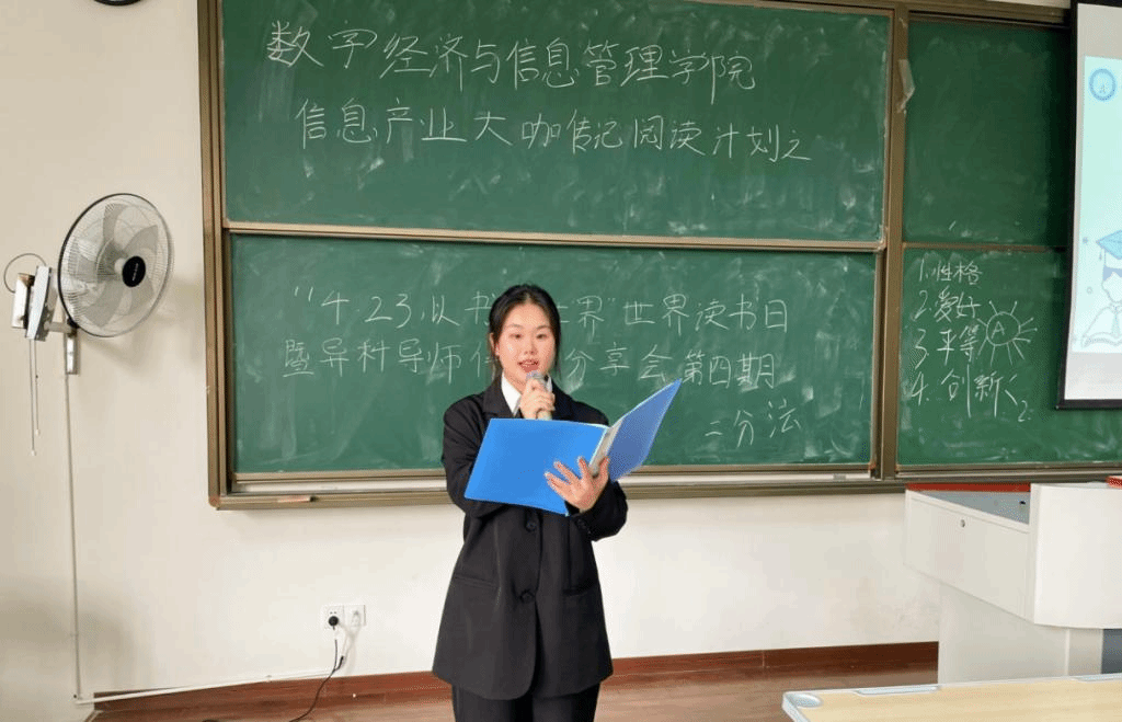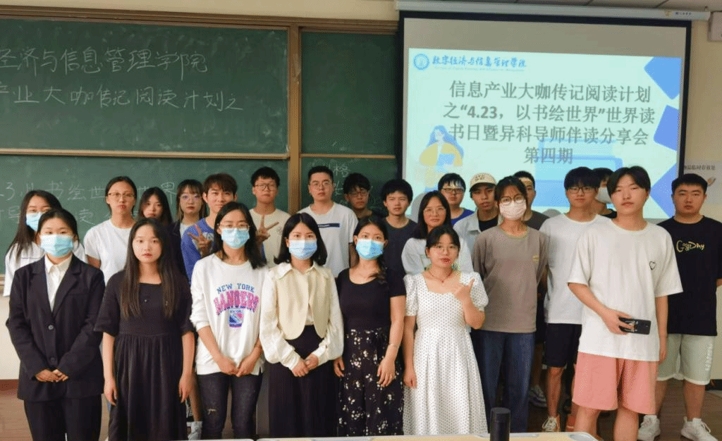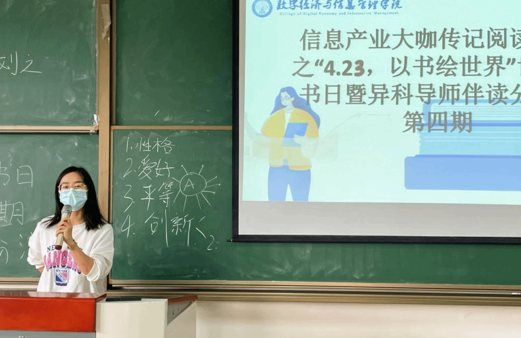 立身以立学为先,立学以读书为本。阅读是打开知识大门的钥匙,在本次世界读书日的背景下,为倡导读书之风,激发学生阅读热情,提高阅读水平,享受阅读乐趣。数字经济与信息管理学院信息产业大咖传记阅读计划之“4.23,以书绘世界”世界读书日暨异科导师伴读分享会于4月22日下午4点在双栀教室301举行。此次活动邀请到通识教育部老师沈敬容老师、黄延果老师以及社团活动板块指导老师刘琳老师共同出席。