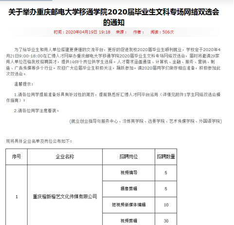 为了给毕业生和用人单位搭建更便捷的交流平台,更好的促进我校毕业生顺利就业,我校于2020年4月21日,顺利开展2020届毕业生文科专场网络双选会。
