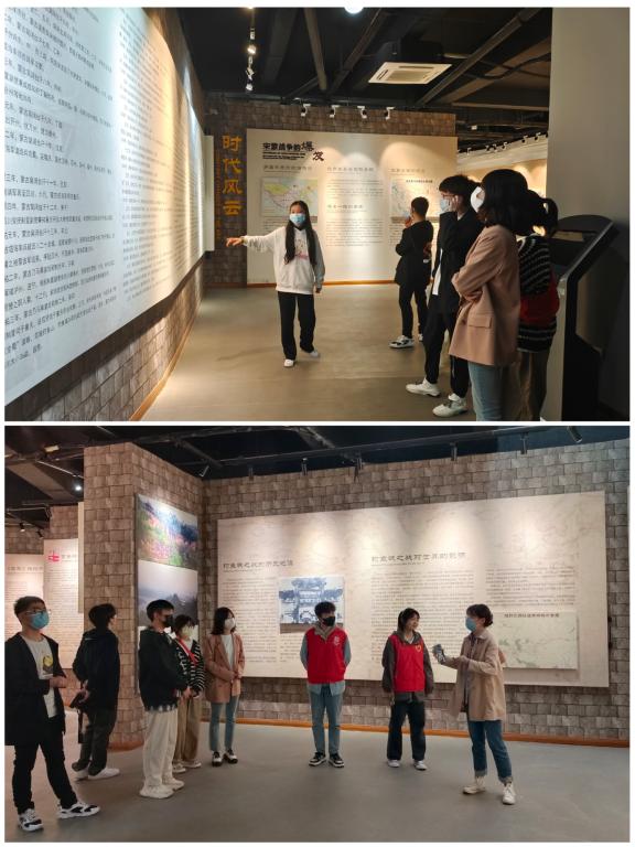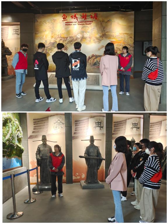 来到二楼展厅,综合管理部部长刘娅向大家浅析了大事记板块的内容,吸引了大家浓厚的兴趣,纷纷对墙上的文字驻足观望,对钓鱼城历史文化博物馆展厅所陈列的文物一探究竟。紧跟综合管理部副部长胡晓的步伐来到三楼展厅,她带领大家去了解钓鱼城之战的历史地位及历史谜团。