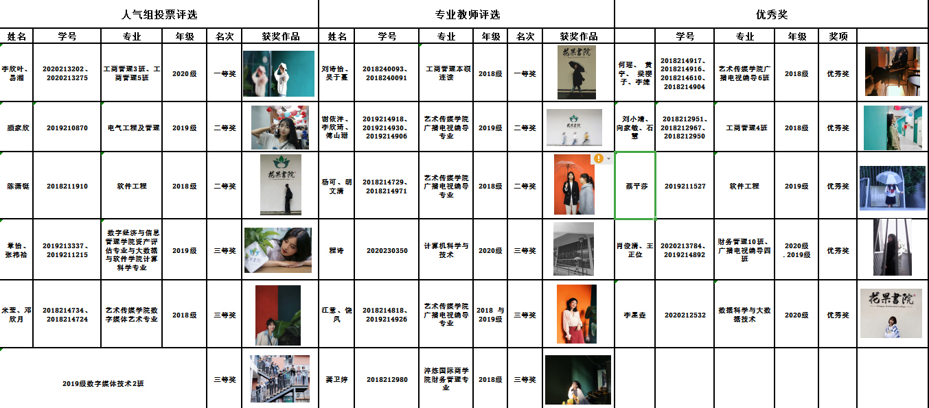 第二届“我与书院最美合影”摄影比赛经过近一个月的作品征集、两天的现场投票以及艺术传媒学院广播电视编导专业吴杨爽老师和杨帆老师的认真评选,秉着公平公正的原则,最终评选出专业组一等奖1名、二等奖2名、三等奖3名,人气组一等奖1名、二等奖2名、三等奖3名。此外,特增设了5名优秀奖以鼓励广大同学们积极参与的热情。