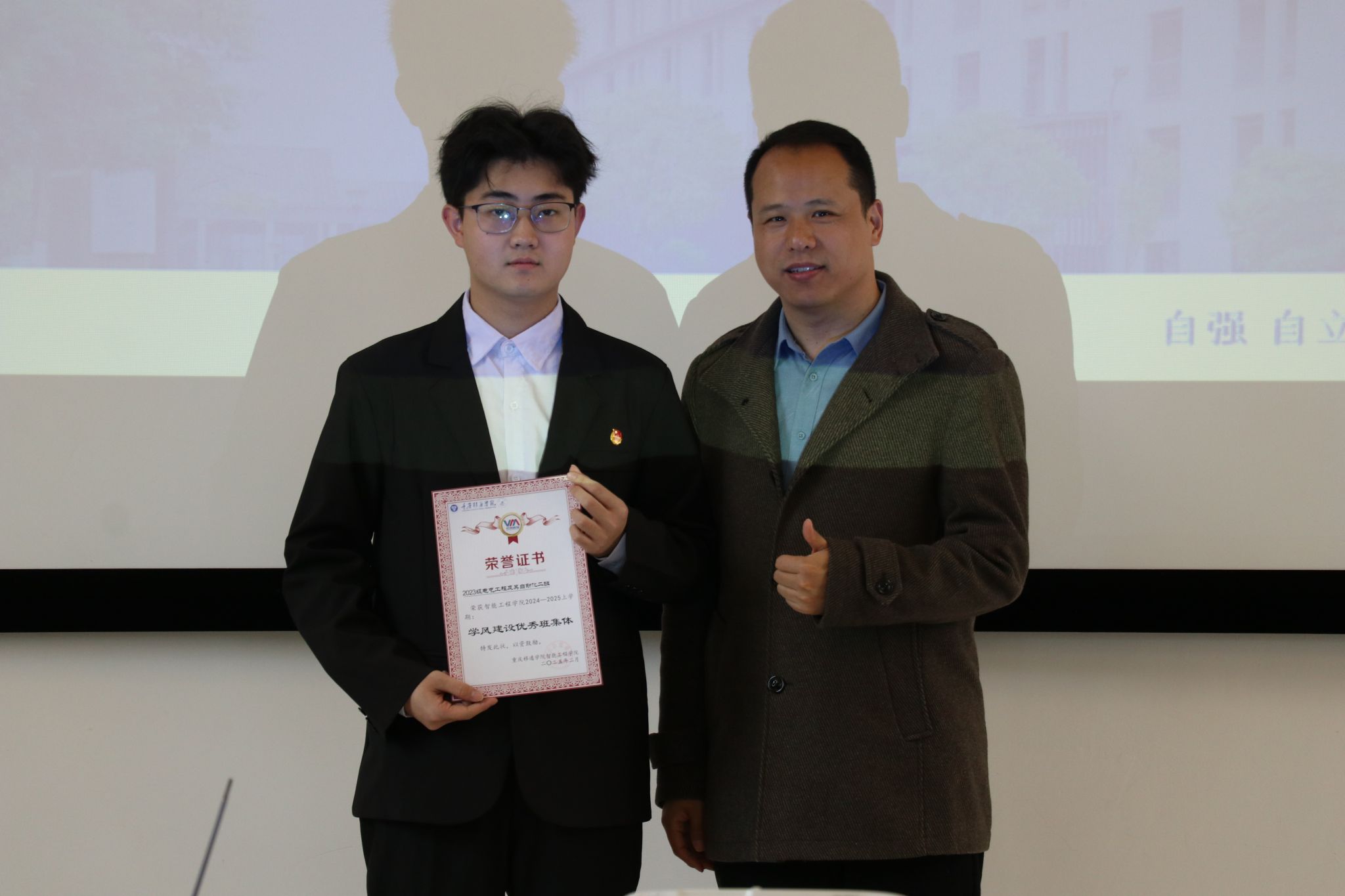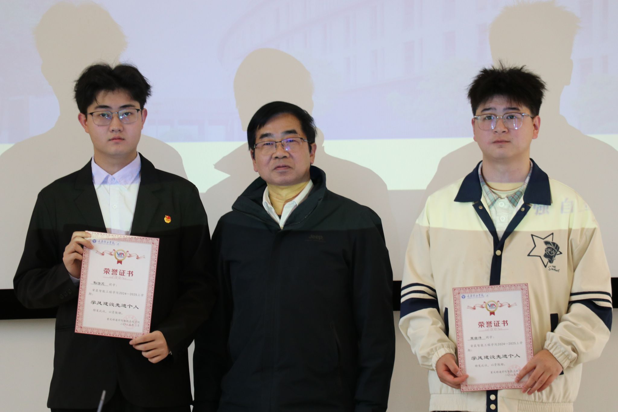大会的首个议程——表彰优秀。主持人通报了在过去的一学期里,学院表现出色的个人和集体,辅导员殷蓉、黄体明、王辉明等7名老师周出勤率达100%,怀高度责任之心,坚守岗位树立敬业榜样。其中,2023级电气工程及其自动化2班以100%的周出勤率和42%的前排率获评了学风建设先进集体。学生优秀代表、学风建设工作突出贡献者孙浩文、王自炜获评学风建设先进个人。学院学工副院长祝玮和教师代表尹超林老师为先进集体和先进个人颁发了荣誉证书。