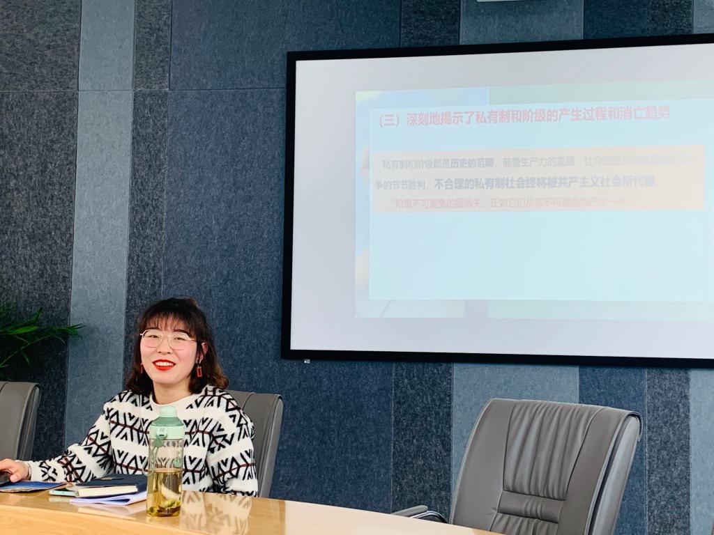 靳老师带领团队成员从原著的写作背景和目的、理论贡献和主要内容浅析等几个方面仔细深入地研读了马列经典书籍《家庭、私有制和国家的起源》。靳老师指出,恩格斯的伟大之处在于他克服了摩尔根理论的缺陷性,从经济的视角阐述了共产主义的产生是必然的结果,而且找到了实现社会主义的现实道路和阶级力量,从而使社会主义真正成为科学。