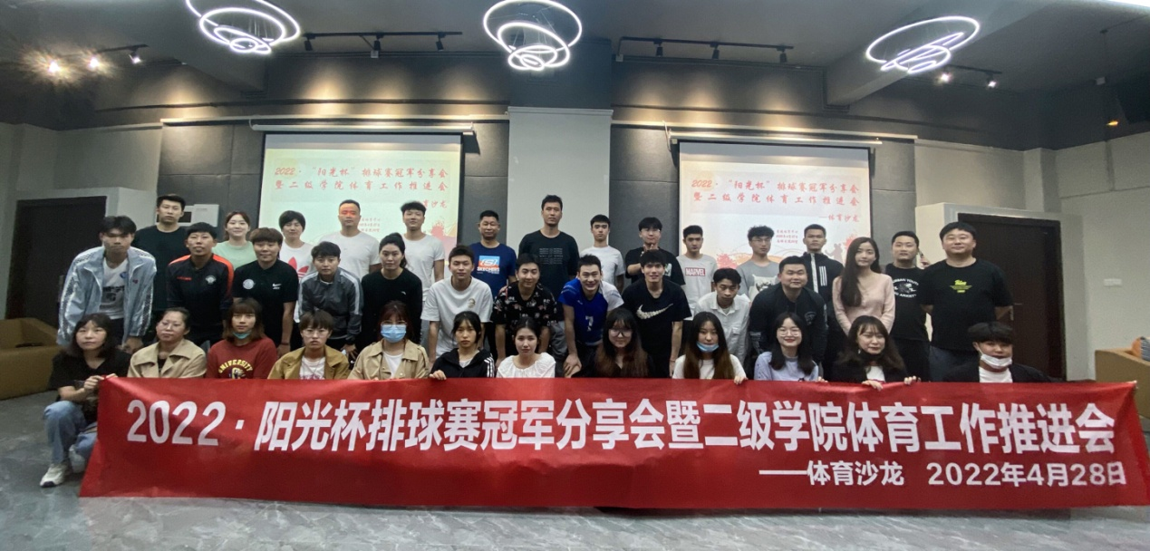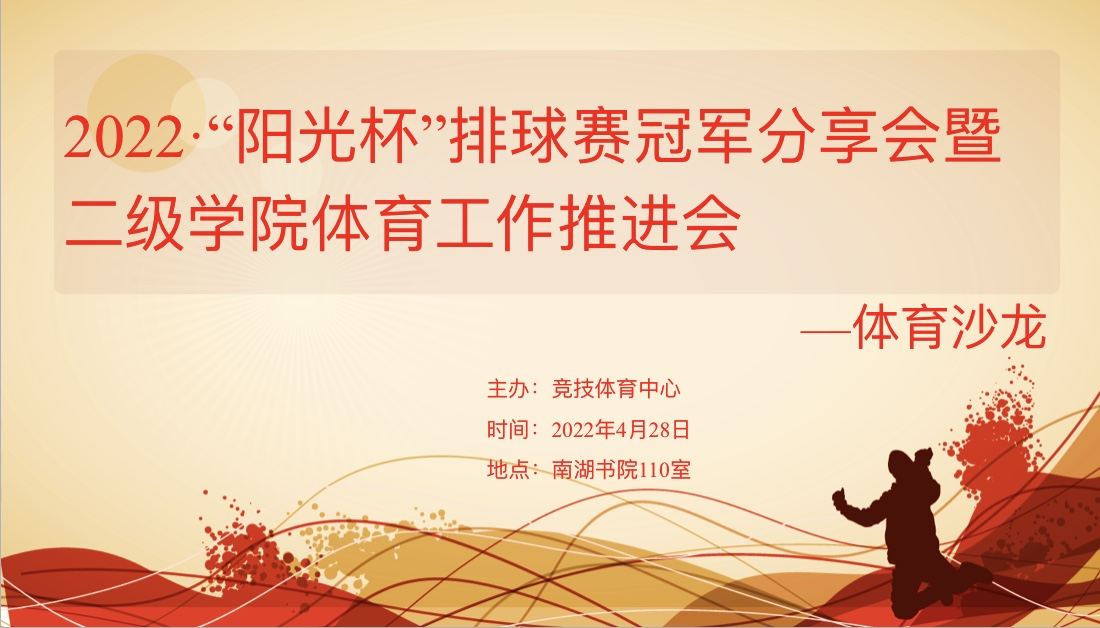 4月28日晚7时,竞技体育中心于南湖书院声影活动室举办了主题为“2022阳光杯排球赛冠军分享会暨二级学院体育工作推进会”的体育沙龙活动。竞技体育中心刘玉林副主任,通信与信息工程学院何燕副院长,大数据与计算机科学学院王焱副院长,体育训练部孙哲主任,体育活动部岳振远主任,各二级学院体育板块负责老师,校篮、足、排教练与各院队代表参加活动。活动由孙哲主任主持。