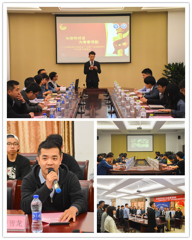 五四运动是中国近代历史上具有划时代意义的事件,它是中华民族走向伟大复兴的历史起点,在这场运动中青年学生成为先头部队,这是一个富有创新精神,敢为人先,自强不息的群体,正是他们的奋起反抗,点燃了社会各界的爱国精神的火焰。为了纪念这场爱国运动,将爱国精神与时俱进,计算机科学系各年级团员骨干于2017年5月3日16:00,在107会议室召开以“与信仰对话,为青春导航”为主题的座谈会,莅临本次座谈会的嘉宾有党委委员、宣传新闻中心主任苏述庚老师,团委唐彬文老师,党办逯静老师,两课部芦智龙老师以及计算机科学系全体学工办老师们。