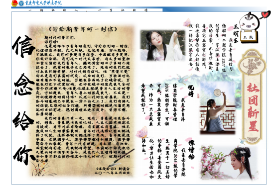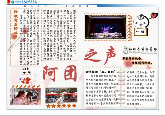 还记的以前社联厚重的工作简报吗?不管你记不记得,从今天开始我们升级了!在社联2.0新时代到来之际,我们社联秘书部大改以往简报的乏味、单调,引入全新板块,我们将“信念给你”加入其中,为各位同学提供一个展示文采的平台;将“社团推星”加入其中,为大家挖掘我们身边的社团“明星”。我们将努力为你的大学生活增添色彩,在你今后的大学生活《阿团之声》将陪伴着你!同样我们期待着你关注的目光和宝贵的意见!!!