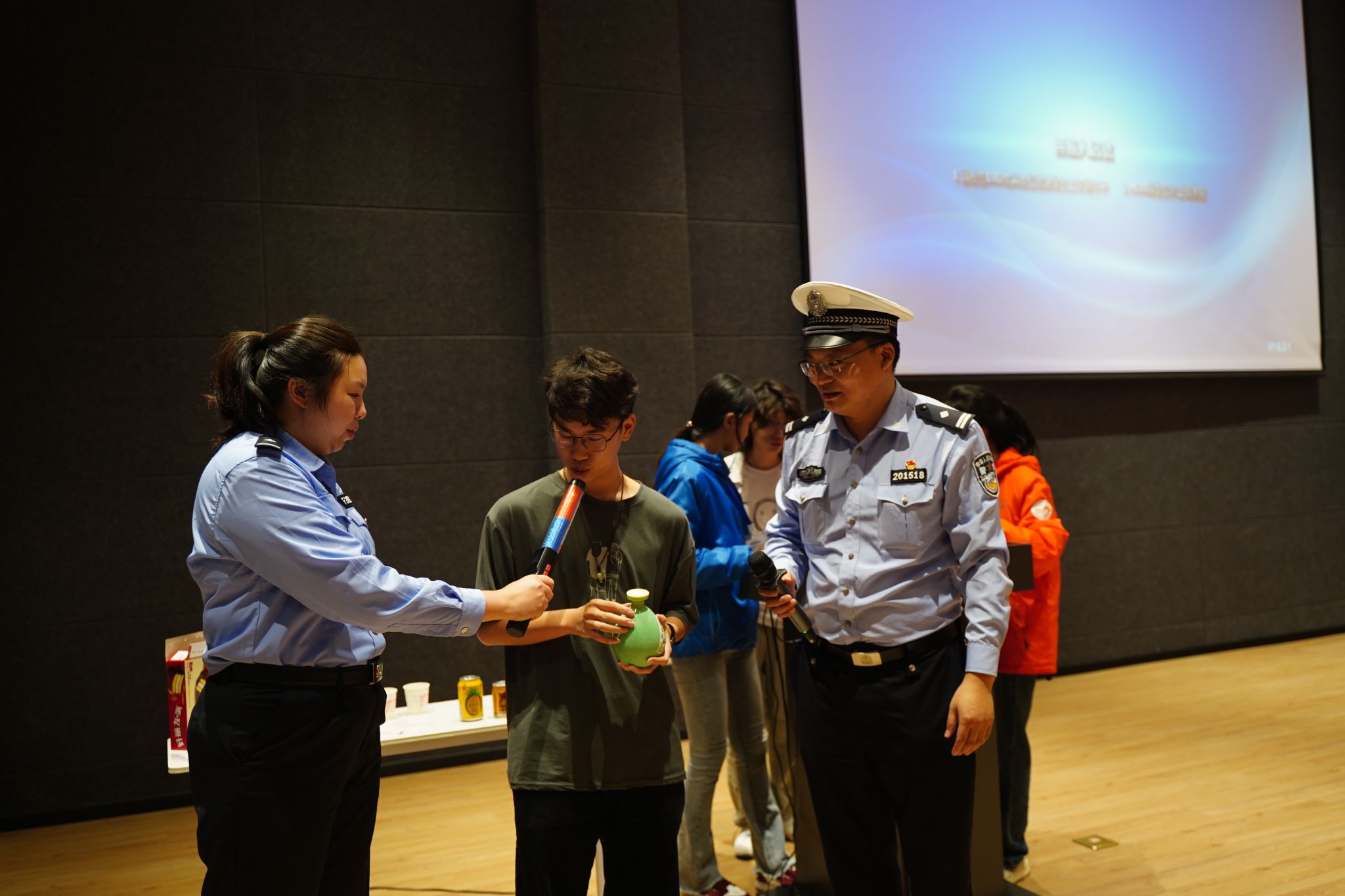宣讲活动伊始,程正超教导员用一个小互动极大调动了同学们的兴趣,在同学们积极踊跃地参与下,程正超教导员选了几位同学到台前分别品尝了龙眼、榴莲、格瓦斯饮品、蛋黄派等食物后,用酒精测试仪分别给各同学做了测试,用现场的测试结果告诉了同学们即使是非酒精产品也可能会造成测试结果不通过,让同学们对可能造成酒精测试不通过的可能性有了更加深刻的认识。