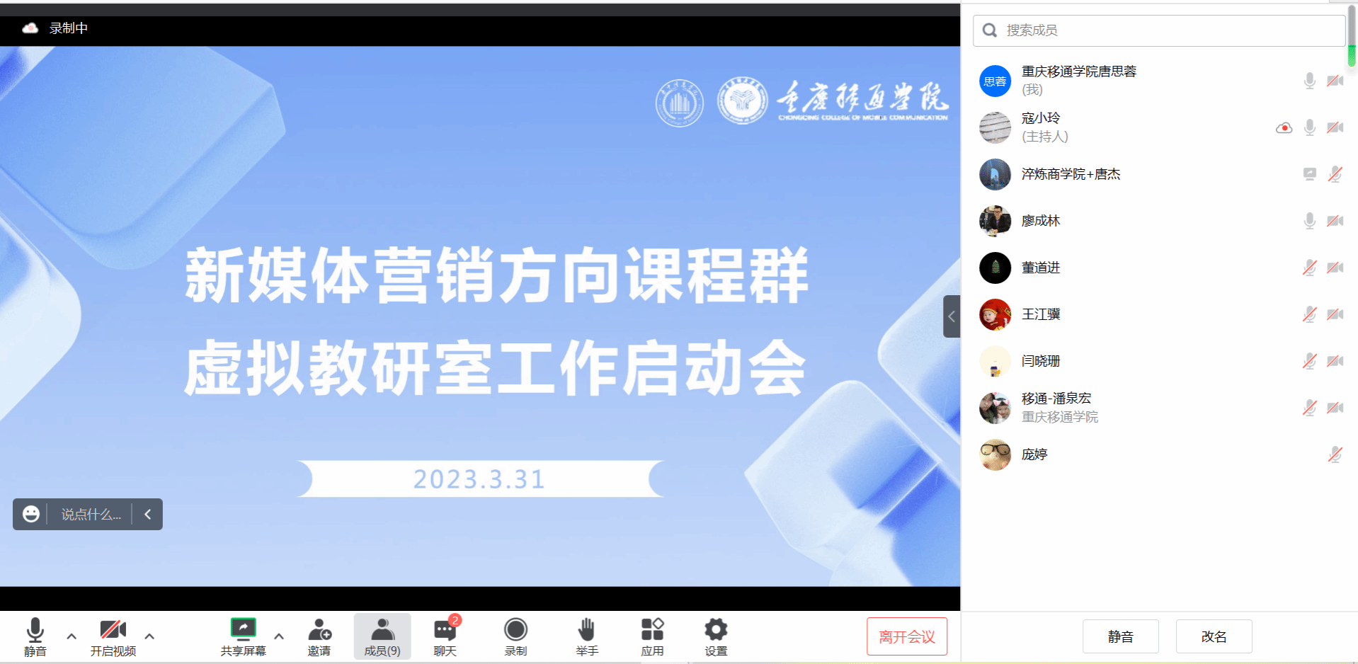 3月31日下午14:00,新媒体营销方向课程群虚拟教研室在腾讯会议上开展了工作启动会。集团商科教育委员会主任、商科带头人廖成林教授,重庆移通学院市场营销教研室主任寇小玲、领导力教研室主任董道进,晋中信息学院市场营销教研室主任王江骥,以及虚拟教研室的全体老师参会。本次会议由重庆移通学院市场营销教研室主任寇小玲主持。
