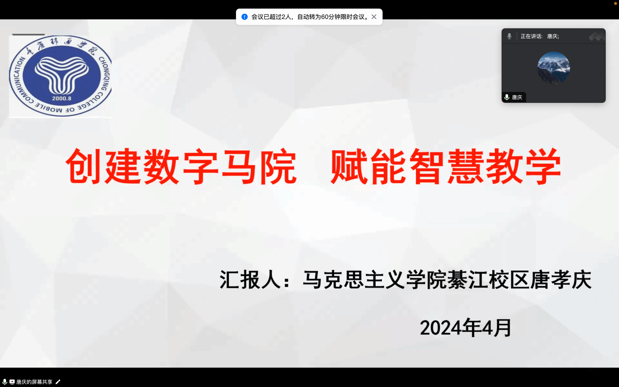 为适应新时代思政课改革创新要求,不断提高育人实效,深化思政课教师对“数字马院”建设工作重要性的认识。2024年4月12日,重庆移通学院马克思主义学院“概论”课虚拟教研室组织开展了经验交流分享会,本次分享会由虚拟教研室主任邹建平老师主持,马克思主义学院唐孝庆副院长主讲,三校四区“概论”课虚拟教研室教师成员参加。