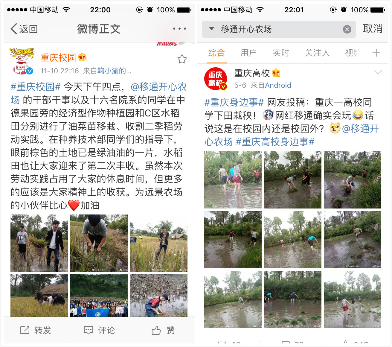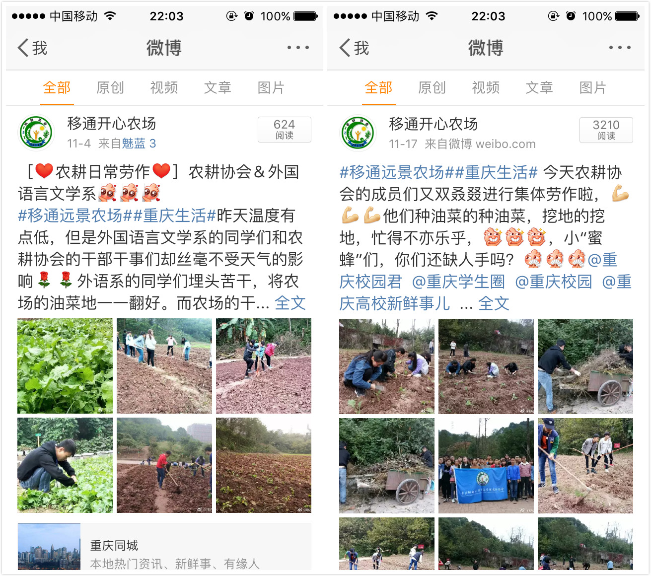 除了这些,农耕协会的同学们每天还在微博“移通开心农场”里宣传和报道各院系同学们的劳动情况,各种大V还经常转载我们的信息,微博除了能看到大家靓丽的劳动身影和劳动感悟外,每天还有我细微的成长变化,欢迎大家都来关注哦!