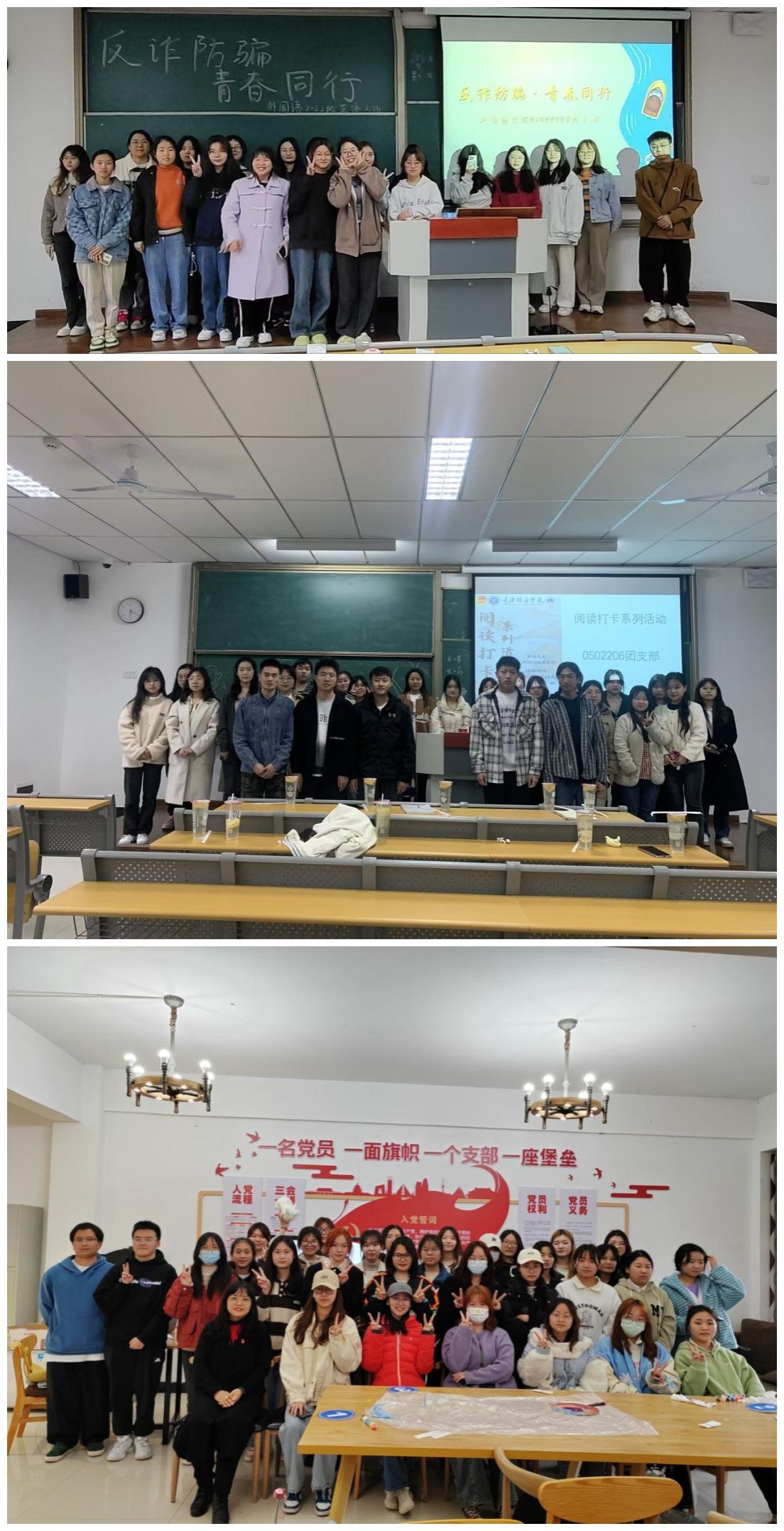2023年3月20日-24日,外国语学院2022级各基层团支部陆续开展完满超级团支部活动。3月23日下午14:00,外国语学院05022203团支部在天空书院205教室成功举办“反诈防骗·青春同行”完满超级团支部活动。本次活动能让同学们熟悉生活中的常见诈骗形式,增强同学们在生活中遇见的诈骗现象灵活应对的防范意识,提高同学们各方面的自我预防、自我保护、自我应对的能力。3月24日,外国语学院05022206团支部,在天空书院揽江厅·师生交流室开展“秀自我风采,展文化魅力”完满超级团支部活动,希望此次活动能够培养同学们良好的阅读习惯,推进读书活动常态化,提升同学们的精神境界。3月24下午15:00,外国语学院05022202团支部在松格党员活动室113成功举办“学党史、强信念、跟党走”完满超级团支部活动,希望在今后的学习生活过程中,希望同学们把红色传统发扬好,把红色文化转化为前进的精神力量。希望全体团员青年以此为契机,凝聚青年共识,强化青年的政治品格。