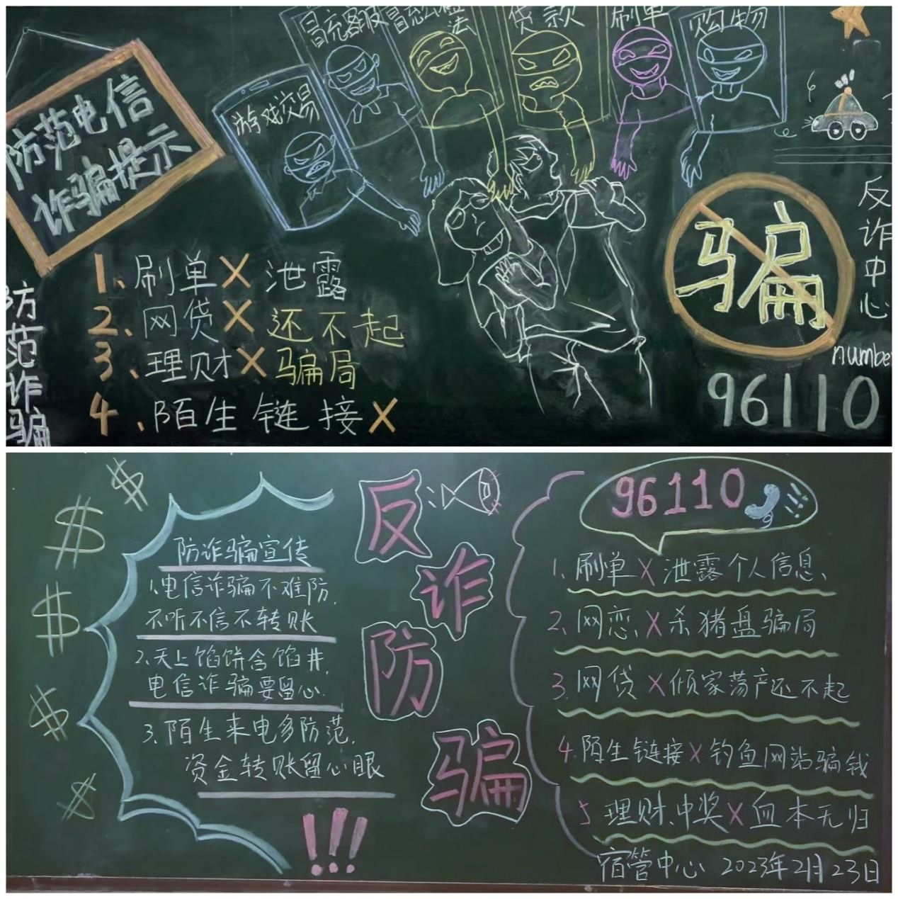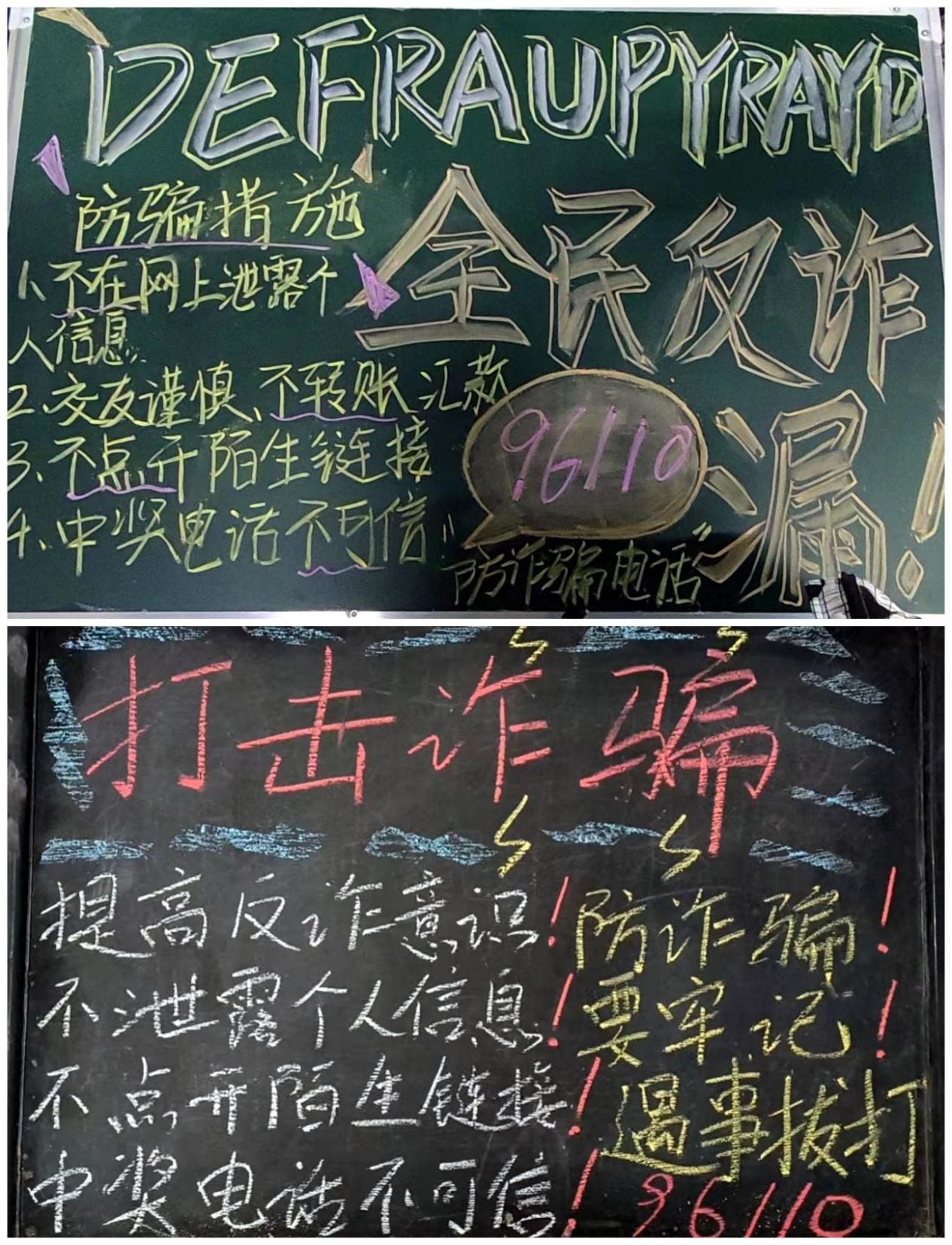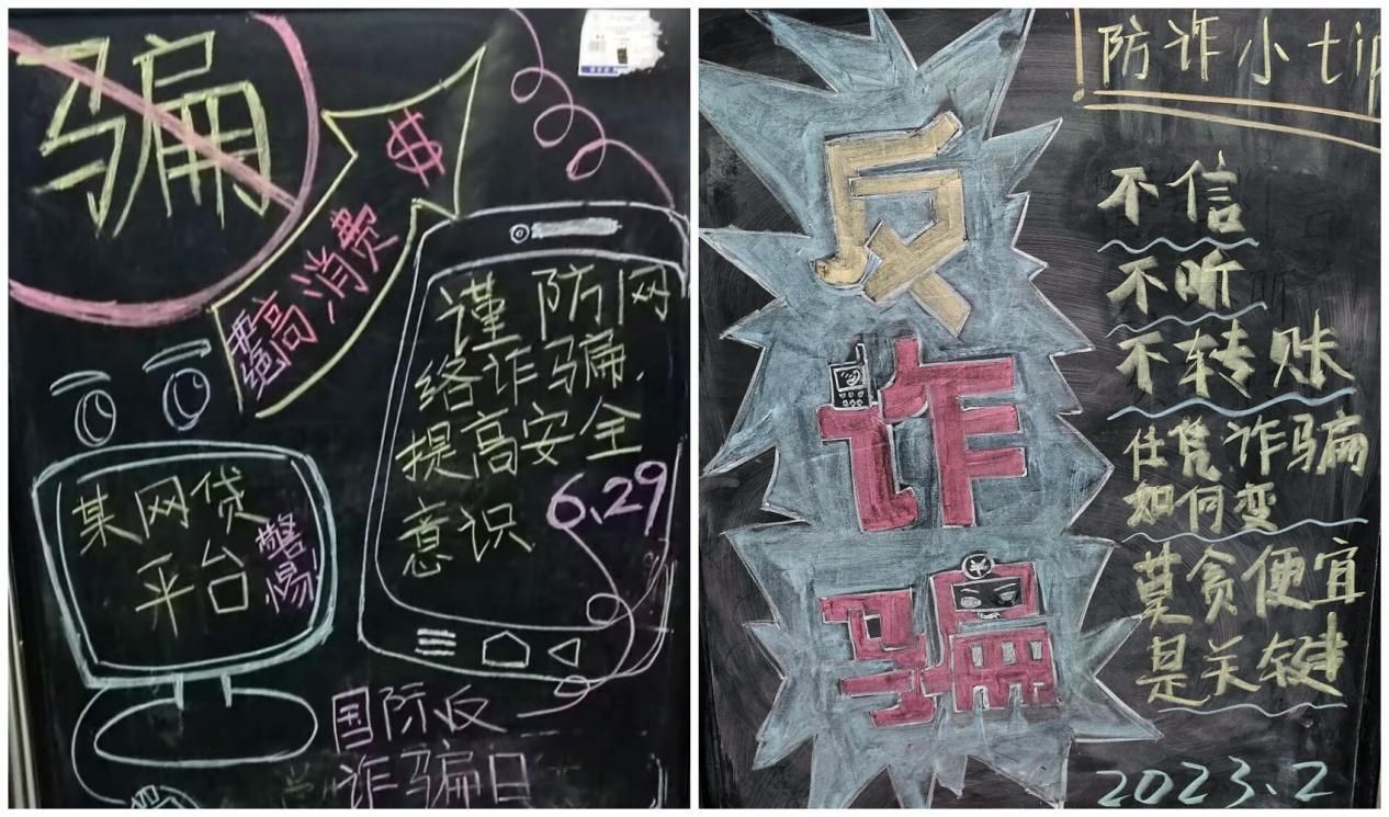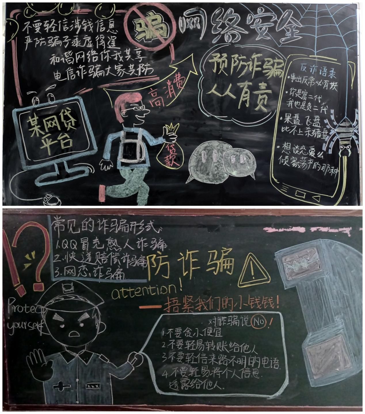 为了同学们能够在妙趣横生的活动中提升防骗意识,并将反诈防骗的主题更加深入内心,增强大家对电信诈骗等犯罪行为的警惕意识和应对能力,校园内各个书院宿舍区除了利用横幅广泛普及反诈防骗宣传内容外,在宿舍楼内用黑板报的形式宣传防诈骗信息。通过精心策划,合理分工,制作了百花齐放的黑板报作品,言简意赅,一语中的提醒大家时刻防骗。