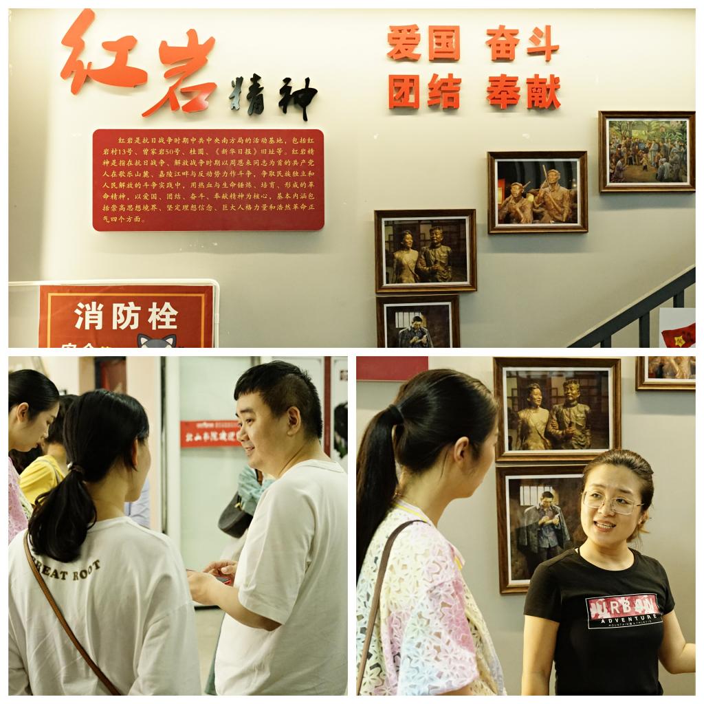 活动伊始,北山书院徐秋月老师向大家介绍到,北山书院红色基地主要是围绕“坚韧力”开展系列活动,由家国情怀馆、大国工匠馆、红岩馆三个主题构成。家国情怀馆,以手工、布偶、素描、彩绘等多种形式呈现了移通学子的家国情怀,充分展现了移通学子艺术方面的才能。大国工匠馆,展示着代表中国传统文化的书法作品、剪纸艺术等等,让同学们感慨到中国传统文化的非凡魅力,从而树立起文化自信。在红岩馆里,主要呈现了红岩革命先烈的相关事迹,随着徐秋月老师的娓娓道来,同学们的思绪飘向了革命战火时期,那墙上鲜红的“红岩精神、永放光芒”更是让现场的同志们心里澎湃不已。铭记红岩精神,传承红色基因,是每一位党员都应该且必须做到的!