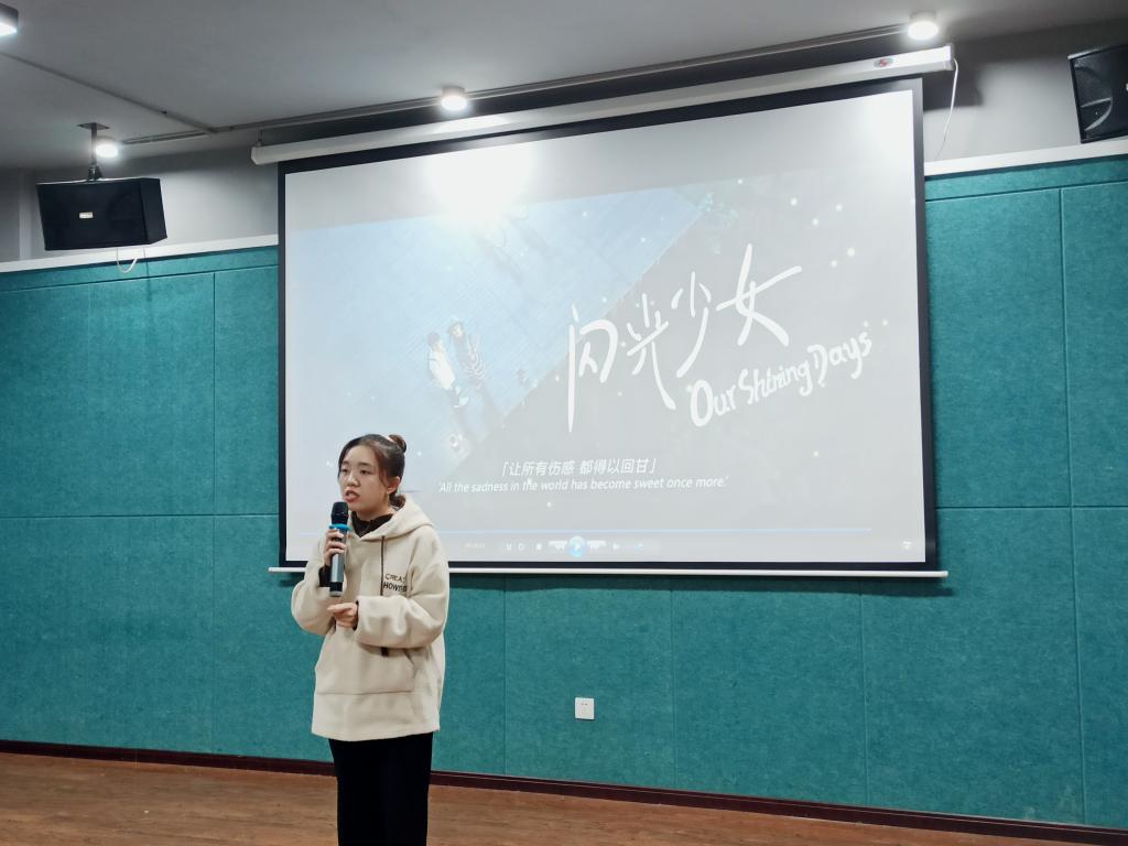 此次活动观赏影片为《闪光少女》。影片中围绕着西乐民乐之争的故事展开,描述了在以并不受到很多人关注的民乐和风靡的西乐激烈比赛中,民乐的同学们通过努力练习,为传统的民乐赢得掌声和关注的故事。