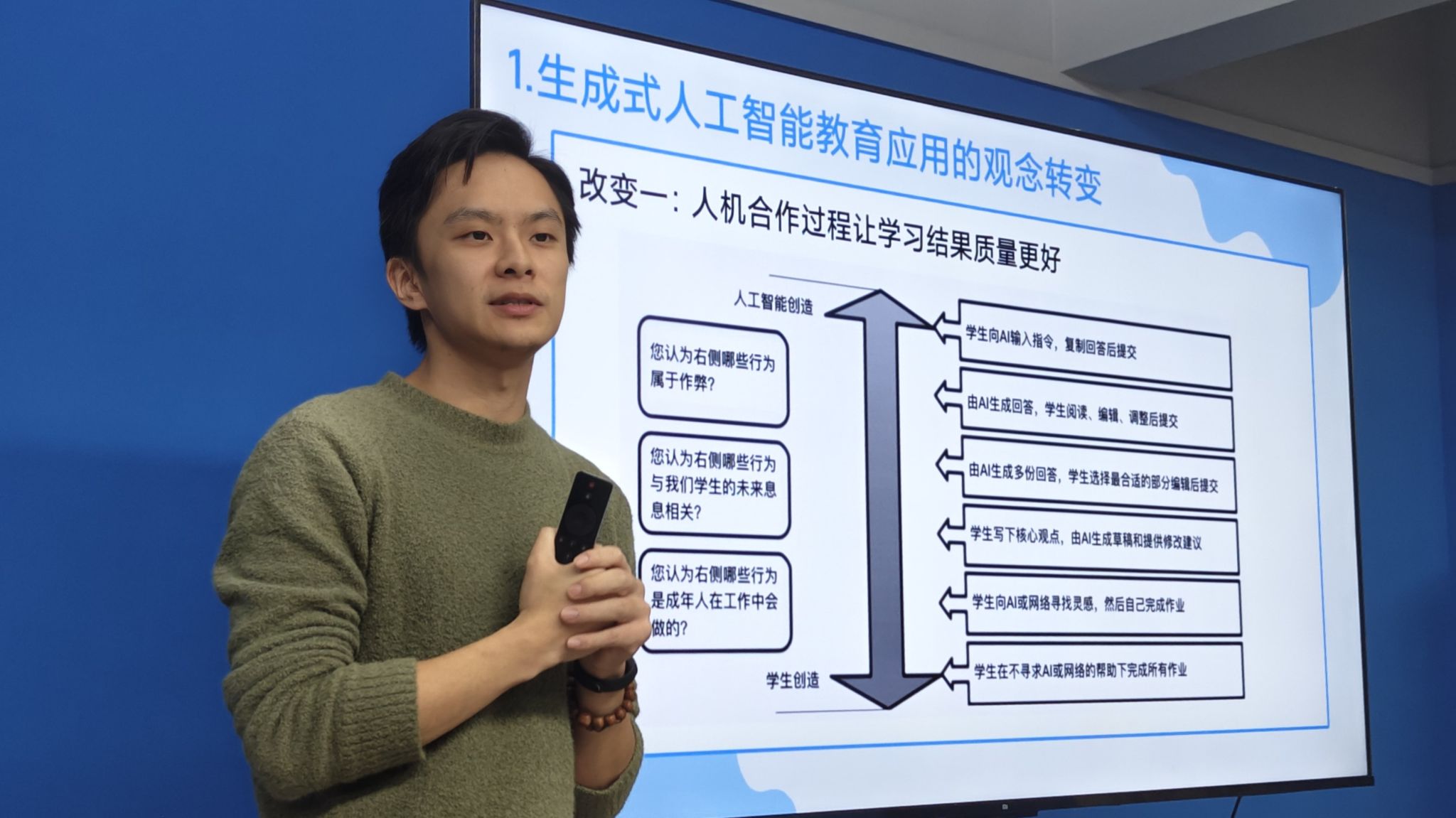 王楚老师和邹伽楠老师就“人工智能赋能课程改革暨智慧课程建设研讨会”中的相关议题进行分享。王楚老师主要援引清华大学计算机系马昱春教授在“AI赋能课程建设和案例分析”专题讲座中的观点,向现场教师阐述了教师自发利用人工智能技术赋能教育教学工作的现状以及学校统筹应用人工智能技术进行教育改革的前景。王老师指出,在AI赋能教学的过程中,明晰教学痛点与利用AI工具同等重要,当我们了解了学生的需求并能将其与课程教学内容相结合后,AI工具的使用才会真正产生实效。