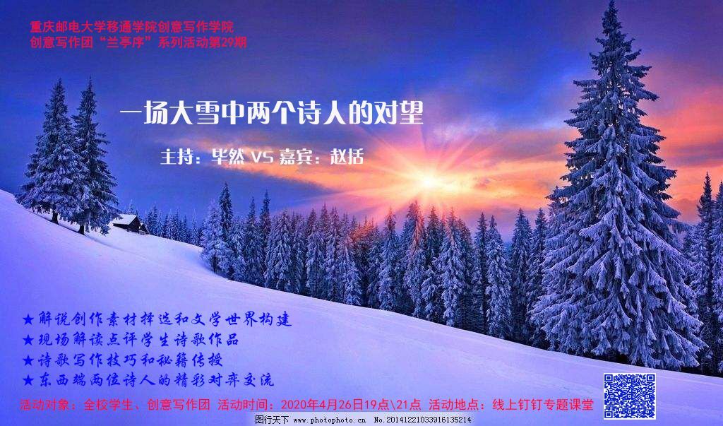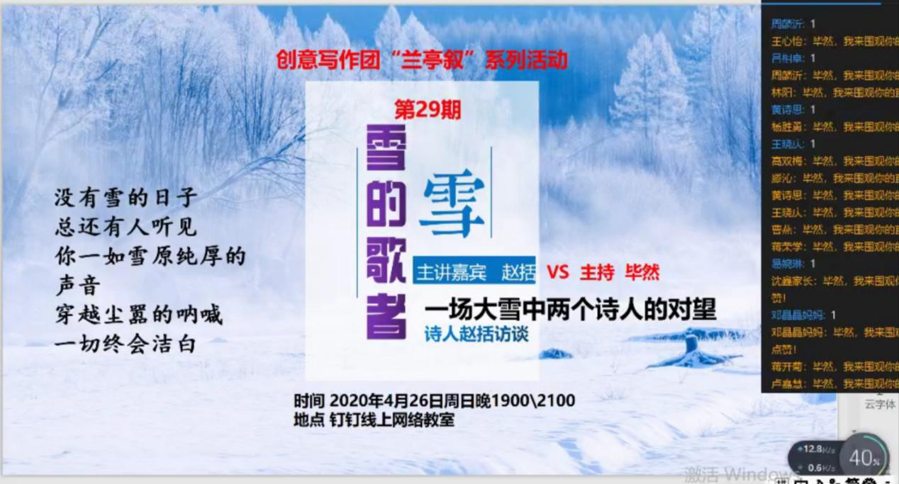 2020年4月26日晚19点-21点30分,创意写作团的指导老师作家毕然老师邀请到了一位擅长写雪诗的诗人赵括先生,通过网络钉钉课堂的方式,面向全校学生、创意写作团的学生进行了一场别有意趣的名为“雪的歌者——一场大雪中两个诗人的对望,诗人赵括先生访谈”活动。这场交流访谈是本学期创意写作团通过网络举办的第29期“兰亭叙”系列文化活动,参加活动的还有部分合川区作家协会的作家及本校的教师。