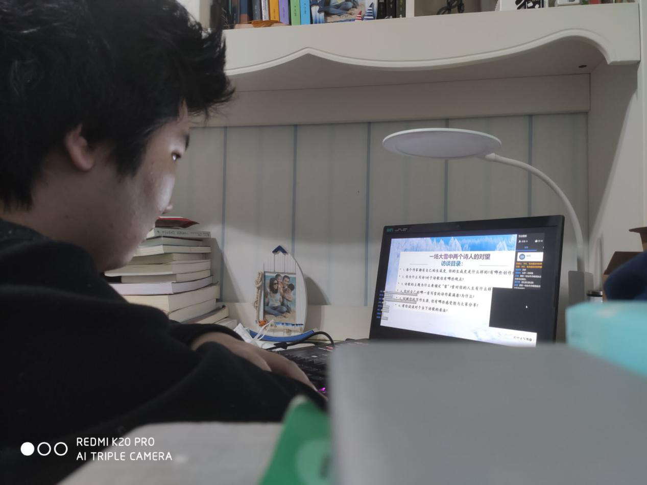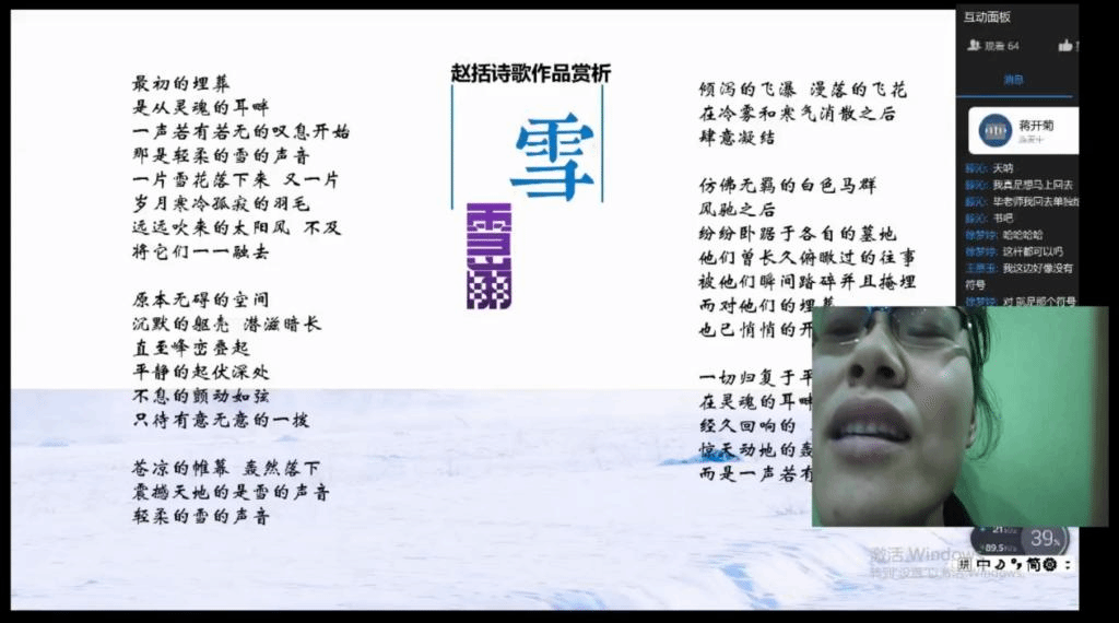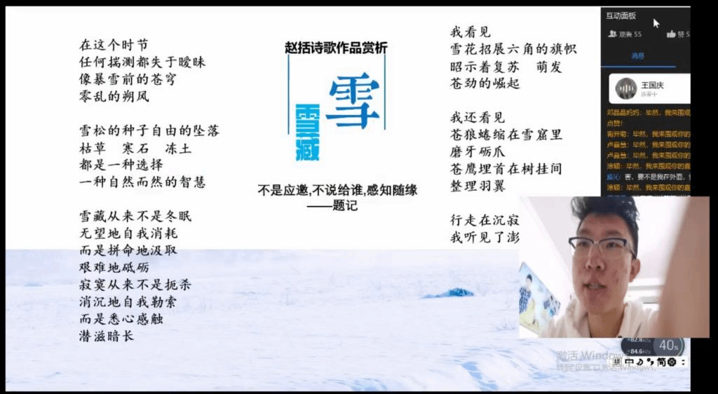 毕然老师在与赵括先生对话访谈的过程中,罗列了七个问题。赵括先生通过网络连线的方式讲述了自己的创作经历及对于诗歌的观点。我们彷佛看到了一个不甘于命运的年轻人,在大雪纷飞中背着一百多万字的武侠小说、诗歌、剧本作品,独创京城,用自己的实力叩响文学的大门。他认为诗歌不仅是情感的表达与宣泄,更要有韵律和节奏之美,没有韵律和节奏,就等于自废武功。“雪”对于赵括先生来说生命中重要的一个场景,其中有很重要的生命链接,是温暖、是悲欢离合、是感悟。尤其是对于自己的诗作《雪藏》的深度解读,引起了听者的共鸣,涂颖同学心有感触地通过互动面板与老师交流:你感觉自己被埋葬,实际上你是在被栽培。