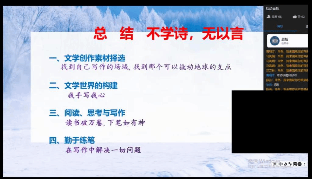 即使无法面对面交流,通过参与这场活动,学习了如何找到自己的文学疆域、如何找到可以撬动地球的那个支点的方法,通过大师眼中的雪,对比自己诗作的不足。