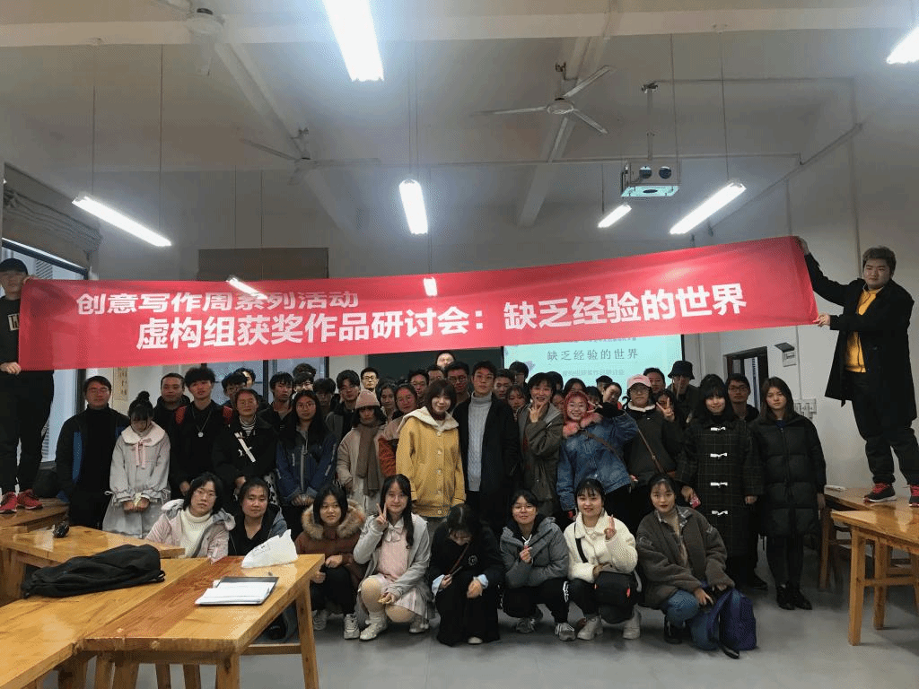 在研讨会临近尾声,我们听到楼上北山斋F201室传来桌子板凳提前移动的声音,于是坏笑,对楼上的同仁是否诚实热爱文学表示质疑。可天下没有不散的宴席,我们收拾好物品,会同诗歌、严肃、类型小说工坊的伙伴们,获奖同学以及老师们,一同合影留念。