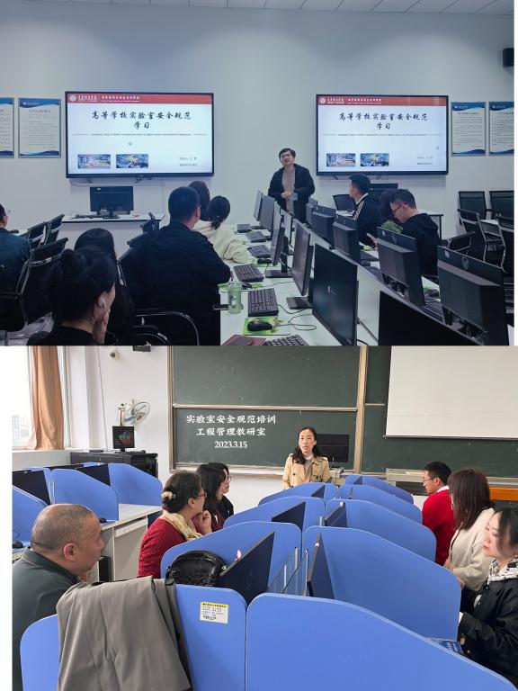 高等学校实验室安全规范学习分教研室在实验室进行,其中信息管理教研室全体教师在双栀505大数据实验室学习,由王哲老师带领大家学习了文件和相关规章制度。工程管理教研室全体教师在S3405实验室学习,由周梦娇老师带领大家学习了安全规范相关文件。