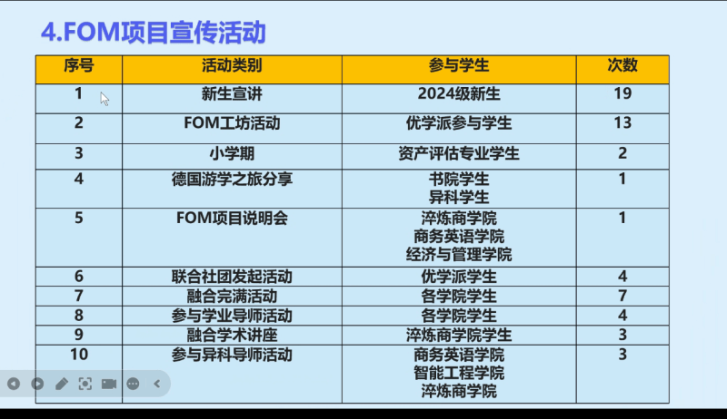 李魁梅副院长则介绍了重庆移通学院国际商学院的教学改革和国际化课程推广情况。她提到,学院课程已涵盖全校商科、双语课等多个模块,计划全校推广商科双语课程,以实现国际化教育目标。在教学成果方面,学院举办了多次教研会、信息化案例申报等活动,并利用留学生资源,搭建留学生混搭学习小组,促进国际交流。