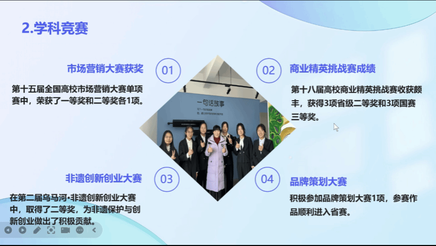 李玲老师分享了2024年国际商科教研室的工作概况,包括职称提升、外出培训、商科实战、学科竞赛等方面的成就,并指出师资结构及双语授课能力是当前面临的挑战。教研室通过组织企业参观、参与全国高校市场营销大赛等活动,取得了多项省级、国家级奖项,同时积极举办新生宣讲、项目宣传等活动,为学生提供专业的FOM本硕项目咨询。