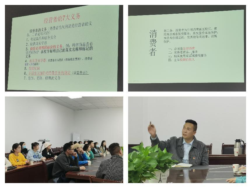 首先,以“消费权益知识”为题进行随机调查。问卷过程中加深了参与师生对消费者权益保护相关法律知识的了解,学习了维护自身合法权益的方法。紧接着,为更进一步使同学们深入了解权益相关知识,特邀请法律援助中心张栗律师向大家宣讲权益相关的法律知识,如:消费者的权力、经营者的7大义务、《欺诈消费者行为处罚办法》规定的欺诈情形等。张栗律师通过购买轿车“假一赔三”的案例引导同学们认识到维权的重要性,并强调要达到维权效果一定要及时取证,利用正当的合法途径维护自身权益。在场的老师和同学们认真聆听,并积极地与张栗律师进行互动。