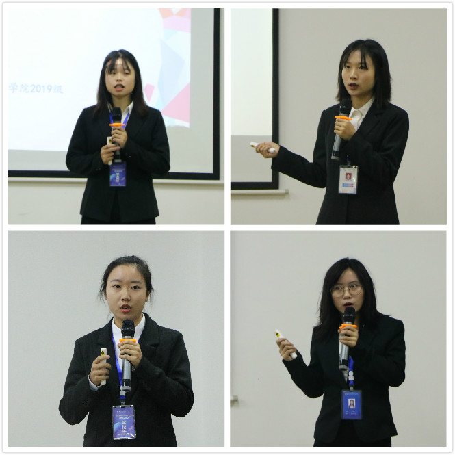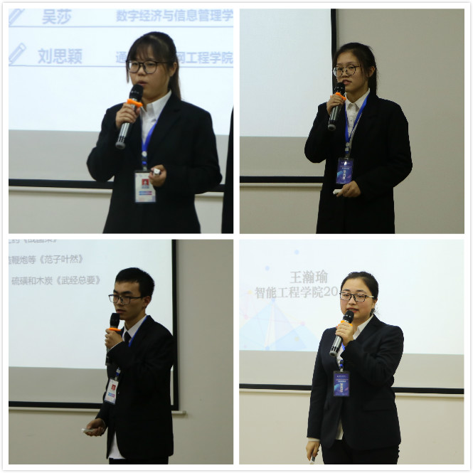 会议下半场,分别由2019级数字与信息管理学院吴莎、刘思颖,2019级通信与物联网工程学院李灿,2019级智能工程学院王翰瑜,4位同学发言。