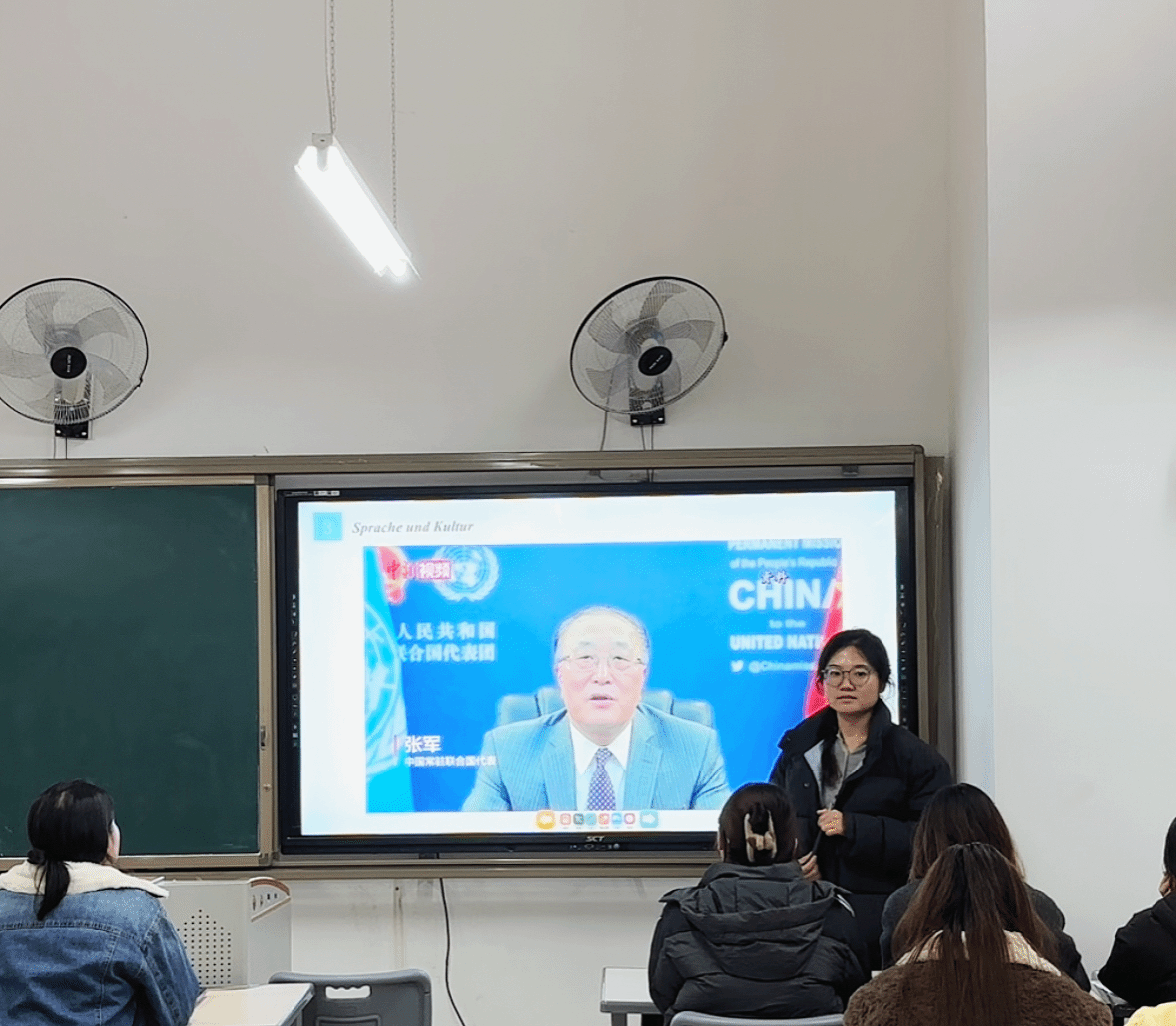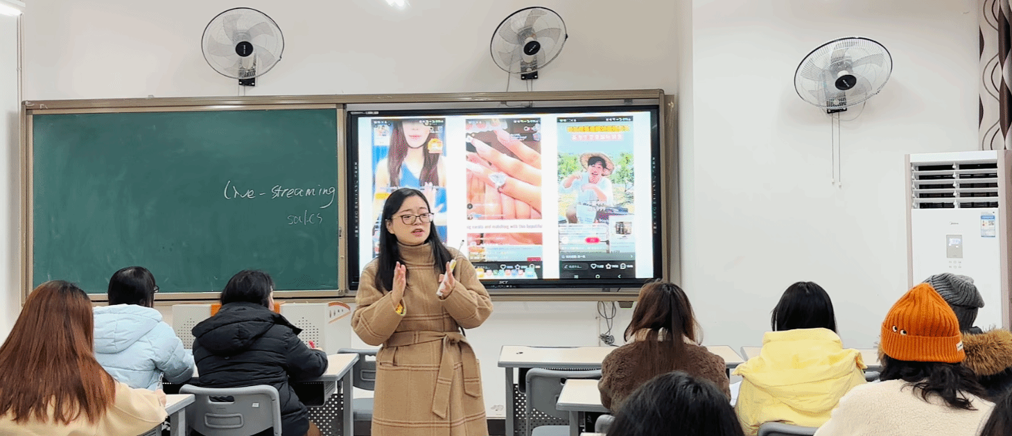 活动伊始,武桐老师通过文章讲述德语语言及文化如何在世界范围内传播,进而阐述中国文化如何传播。结合“二十四节气”短视频揭示中国重要节气——“谷雨”、“仓颉造字”、“4·20联合国中文日”等,运用书法、麻将、中国文学、茶道、中医、舞狮等传统媒介传播中国文化。蒋成侠老师的教学中,用激情澎湃的英语演讲,带领师生走进“直播带货”的现场,结合网红主播及成功案例从多方面深入剖析市场营销策略,“直播+文化”、“直播+英语语言”、有趣幽默的方式、产品定位、多风格多类型等方式进行销售中国产品。在老师的引导下,学生纷纷用英语表达自己的看法,现场气氛热烈而富有深度。