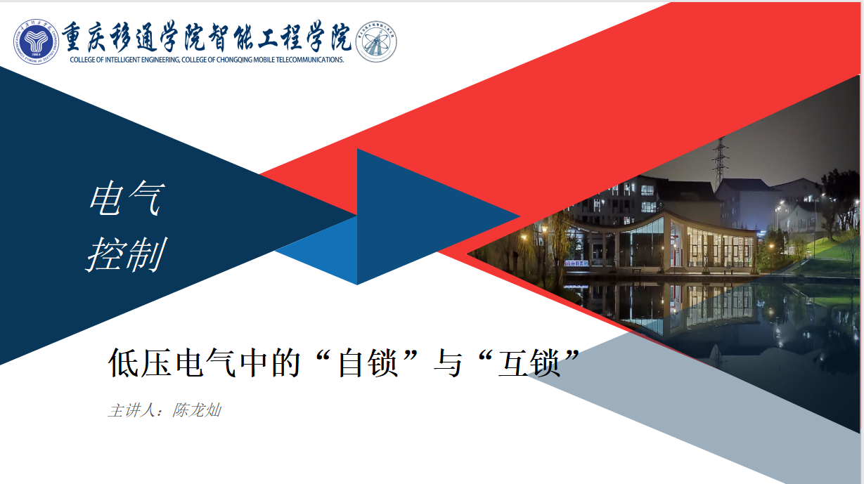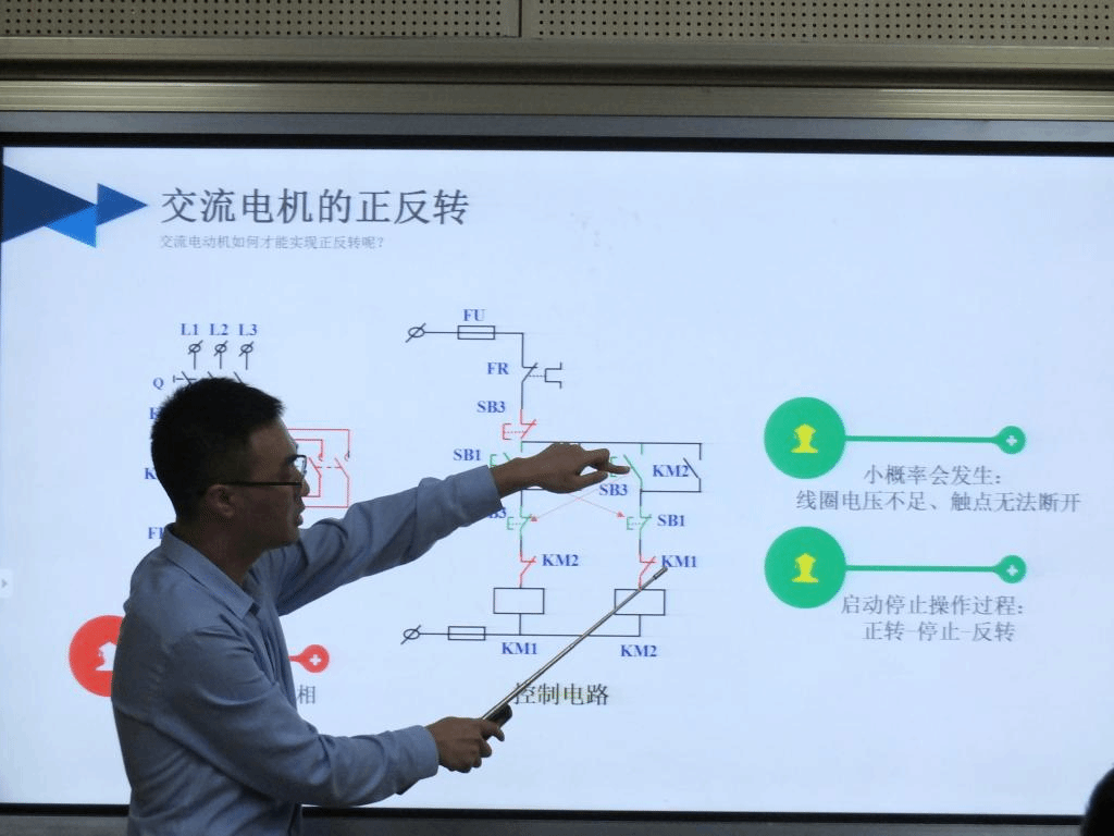 本次示范课旨在传授优秀的教学方法和经验,促进教学内容和方法的改革,提高教育教学质量。陈龙灿老师讲课的主题是“低压电器中的自锁与互锁”,陈老师首先带领学生回顾了断路器、接触器和继电器的基本知识,通过设问如何控制电机的正反转引入本课的学习内容,陈老师采用化繁为简、以疑激思的教学方法将复杂问题逐步分解,结合板书和多媒体动画演示,抽丝剥茧,层层深入,引导学生解决了电机正转、反转、停止等控制难题,通过设计电机正反转的内容引入了低压电器中“自锁”与“互锁”的重要概念。