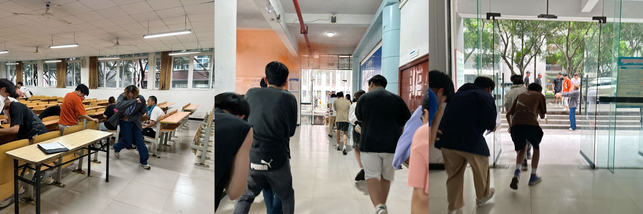 随着彭处长的哨声响起、烟饼燃烧,全体成员有序疏散至室外,在演练过程中,保卫处领导悉心指挥,所有成员竭力匍匐前进、模拟打湿袖口/衣物、捂住口鼻、有序退场、做好疏散人员报数工作,以确认所有人员均离开危险环境。消防意识,应被铭记于你我心间。最后,再次向全国消防员致敬!