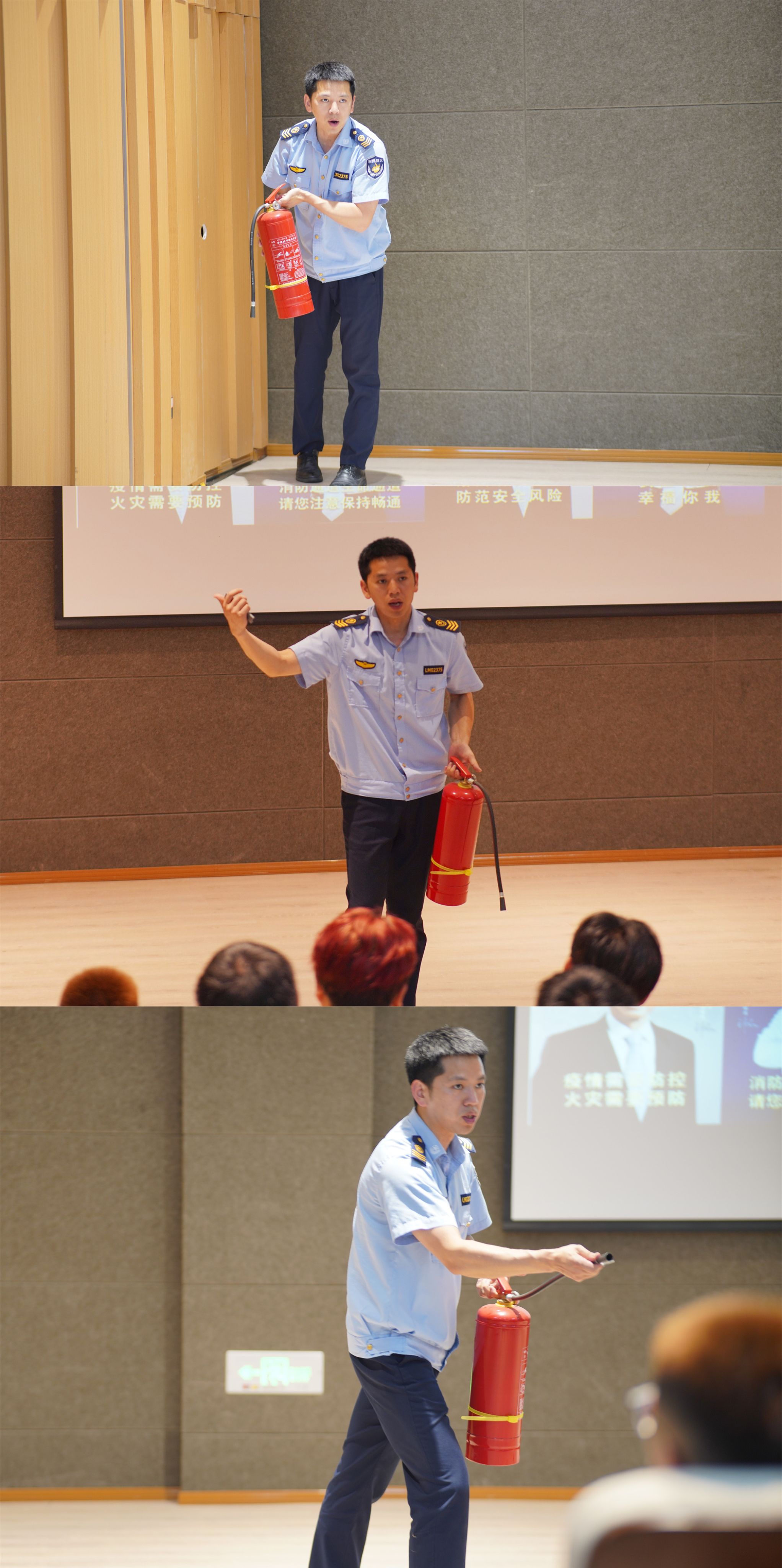“防止发生火灾的关键,是做好火灾的预防”。在对自保问题进行了讨论后,熊教官就“如何预防火灾、如何应对火灾”这一命题展开论述,带领同学们排查自己所处环境(教室、宿舍、家中等)的火灾安全隐患,如环境是否置办烟感器、学生是否清晰环境中电闸及消火栓所在位置等。随后,熊教官向同学们示范了灭火器的正确使用方法,讲解了灭火器使用期间的注意事项,如切忌忘拔保险销、需手握喷嘴以便控制喷射方向等。