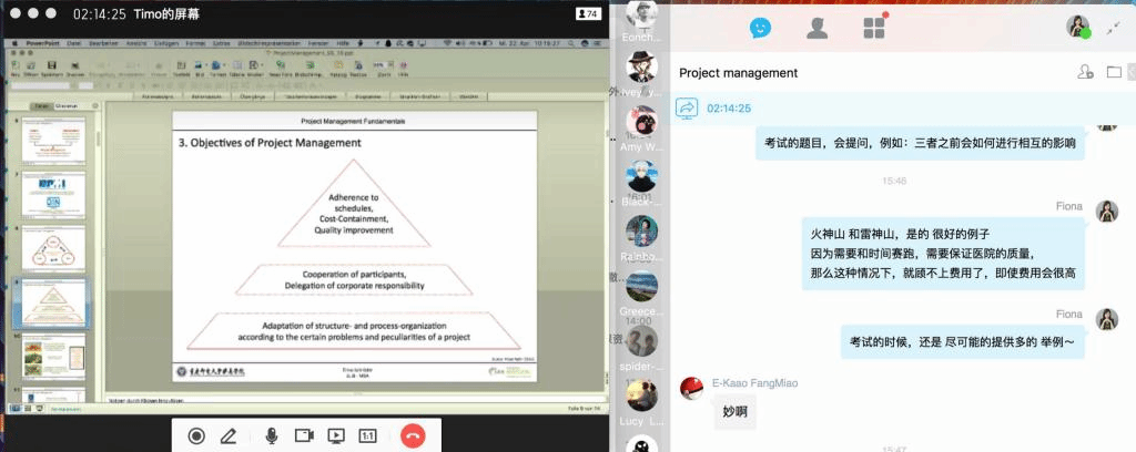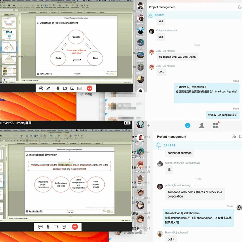 首先德方教授做了非常充分的课前准备工作,从精美详尽的课件,到时下热门的具体例子,比如疫情防控工作中快速建立起的火神山和雷神山医院就是一个很好的项目管理案例。其次,德方教授的敬业精神也得到了多方赞誉,为了确保同学们上课的状态,外教在为我院学生进行直播教学的时候,正是德国的清晨。在直播间偶尔还能听见窗外鸟儿的啼唱,婉转清脆,为课堂也带来了一丝欢快与清新,让人心旷神怡!课上,德方教授在教学新知时循循善诱,分发挥了学生的主动性,师生互动氛围极好,其精彩纷呈的授课,也常常让同学们忘却了这6小时的时差。