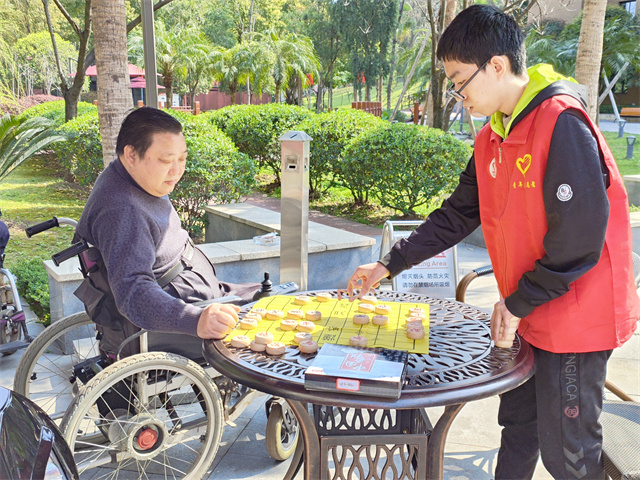 志愿者们分工明确,在一边传来欢声笑语的同时,另一边逸轩棋社的志愿者陪着老兵们正热火朝天地开展着象棋比赛。双方在棋盘上横马跳卒,车攻炮轰,你来我往,难解难分。老兵们对象棋充满了兴趣,紧紧围着小小的一张棋盘“指点江山”。志愿者了解到象棋是老兵们为数不多的乐趣之一,以前都是自己互相比拼,今天可以和志愿者一起共享这份乐趣,感到十分新奇与满足。看着老兵们脸上展开的笑颜,志愿者十分自豪,这又将变成一段美好有意义的珍贵回忆。