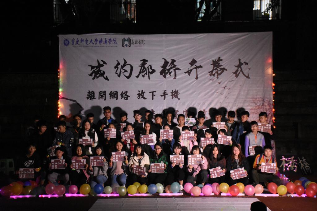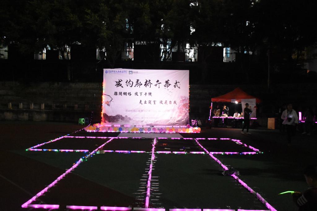 开幕式最后,廊桥书院指导孙庆涛为本次活动致辞,鼓励每个活动参与者走出宿舍、沟通交流、养成良好生活习惯、拓宽视野、提升格局。参与活动的同学和廊桥书院两位指导老师孙庆涛、赖昌容被分为8个小组,进行了趣味小游戏以及赛前热身,大家共同完成减约廊桥第一期荧光夜跑。