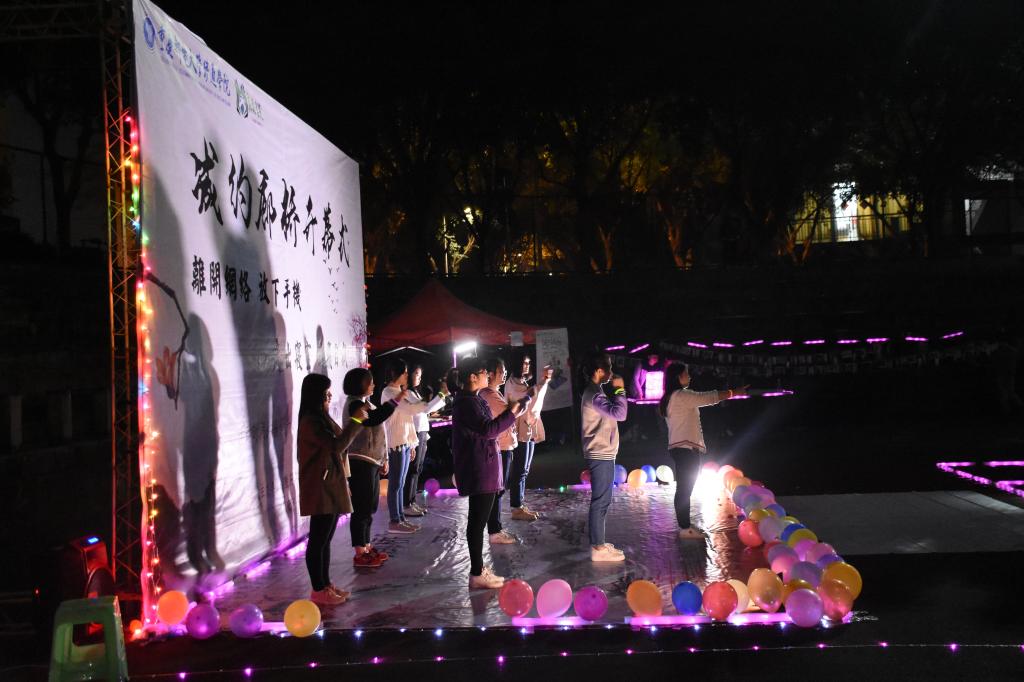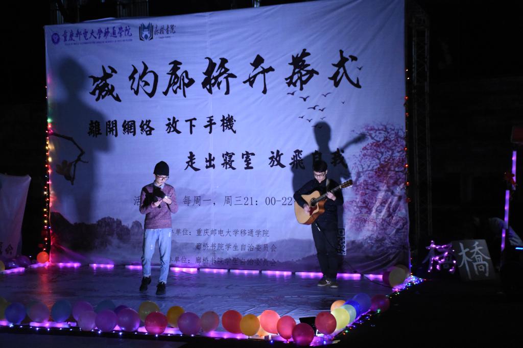 开幕式之初,台下观众打开手机灯,现场“星光”摇曳,华美异常。在优美的乐曲声中,手语社成员用手画出彩虹,节目中所呈现出的温情更是诠释了她们“让爱成为行动”的宗旨。欢快的吉他声、悠扬的歌声似一把炽热的鼓槌,敲打着现场每一个人的心,这是器乐社和廊桥书院学生的合作。