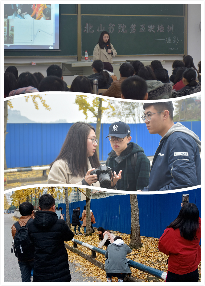 在培训中,郭老师在准备的各种不同的照片中,用例子对照去讲解拍摄中所需的技巧,如构图、光线等。其中构图也包括很多种,其中最代表性的为:简单明了的九宫格、画面庄重的十字形、宁静优雅的正三角、活泼轻快的倒三角、专属风景的s型。在拍摄过程中,还有不可或缺的渐次式与散点式两大法宝。光线也很有讲究分为顺光、逆光、斜侧光等。在生动的照片讲解中,同学们更加直观地用视觉体验去发现每一种拍摄技巧的优缺点,其中后期的PS修图也是摄影作品不可或缺的一步操作。纸上谈兵的效果总是没有在实际操作中的效果呈现的明显,在基础知识讲解后,郭老师带领着大家亲自动手拍摄,同学们都都积极参与到其中,并且不断的去求教老师,在不断的总结和改变中,次次的细微改变去提升自我。培训结束后,同学们和老师在银杏树下拍出属于自己的美好瞬间。
