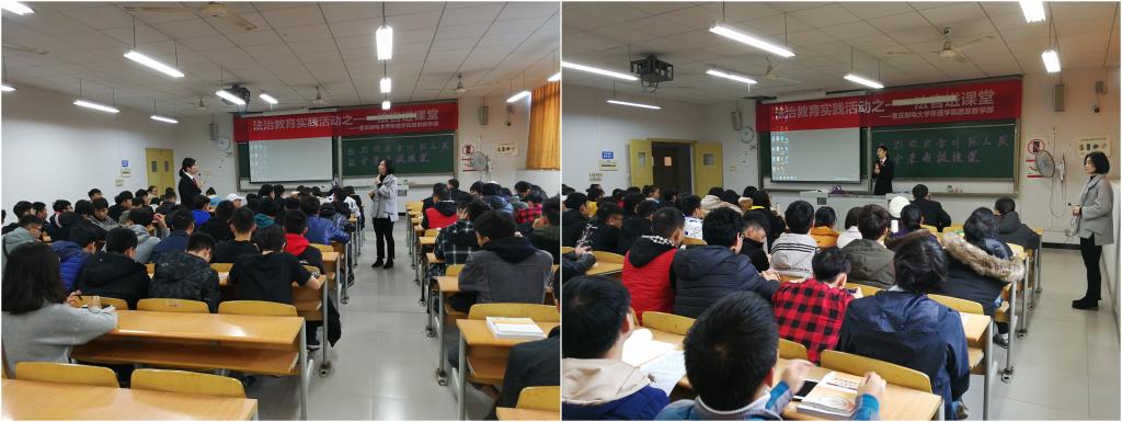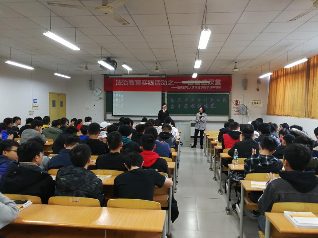 筑梦路上,与法同行。12月4日,时值第五个国家宪法日,思政教学部德育教研室《思想道德修养与法律基础》课程配合教学内容积极开展法治教育实践活动,特邀请合川区人民法院张帅法官来我校开展了一堂精彩的法律知识讲授,授课对象为2018级计算机科学与技术1-3班的98名同学,活动由思政教学部教师陈静主持。