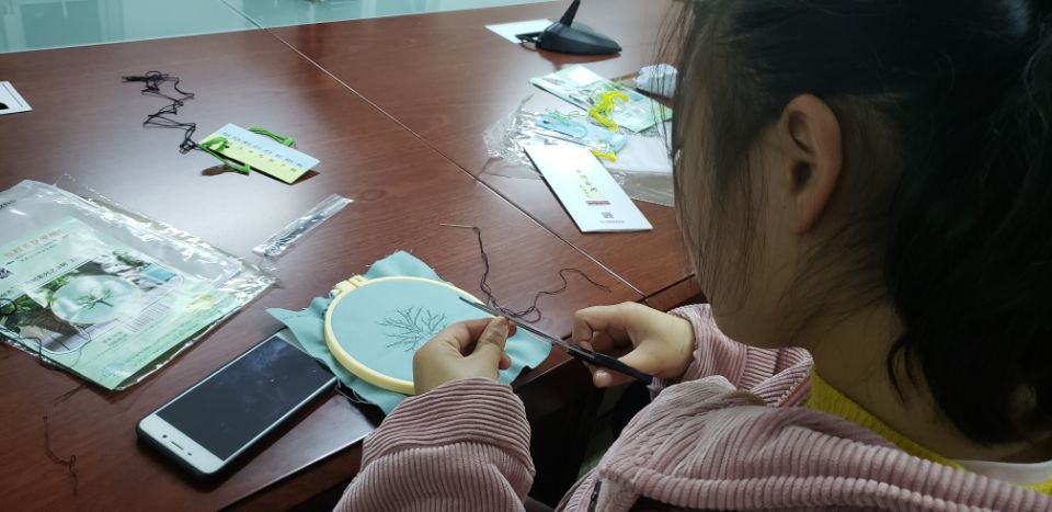 单老师从刺绣的演变发展讲到刺绣的不同针法,并用图片的形式形象的展示了常用针法的运用。“刺绣的针法有上百种,常用的针法有晕针、铺针、滚针、截针、掺针、沙针、盖针等。各种针法相互使用,或粗或细,虚实结合。晕针可以用来表现绣物的质感,体现所绣物品的光、色、形针脚严谨整齐又不失柔和……”。同时,单老师根据同学们拿到手上的不同材料,一一指导同学们针法的运用,同学们一个绣绷,一块绣布,一根针,一条线,在老师的指导下认真而又紧张的开始了创作,两个小时的时间转瞬即逝,在针与线的挥舞中同学们意犹未尽,久久不肯离去。