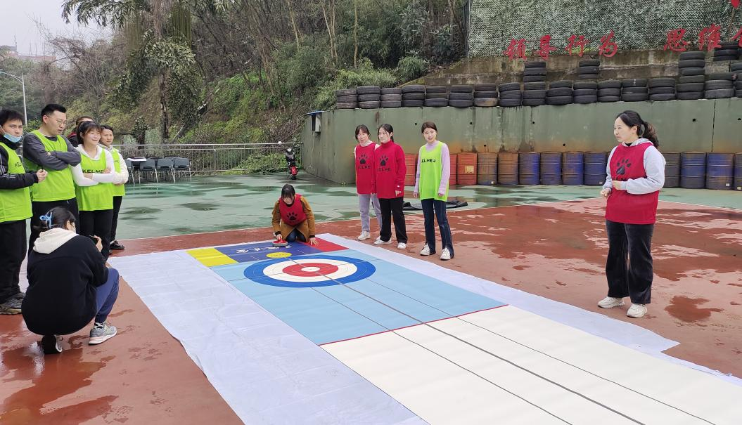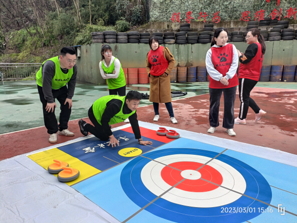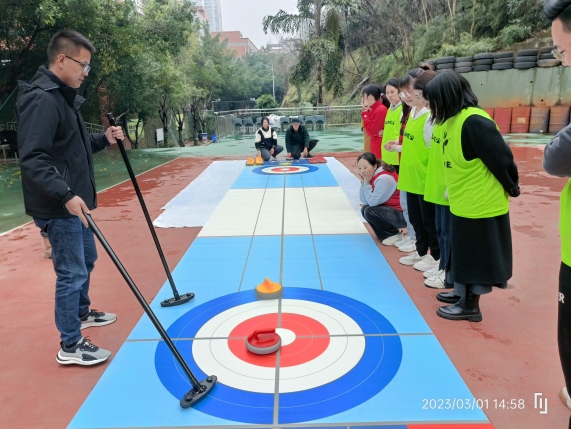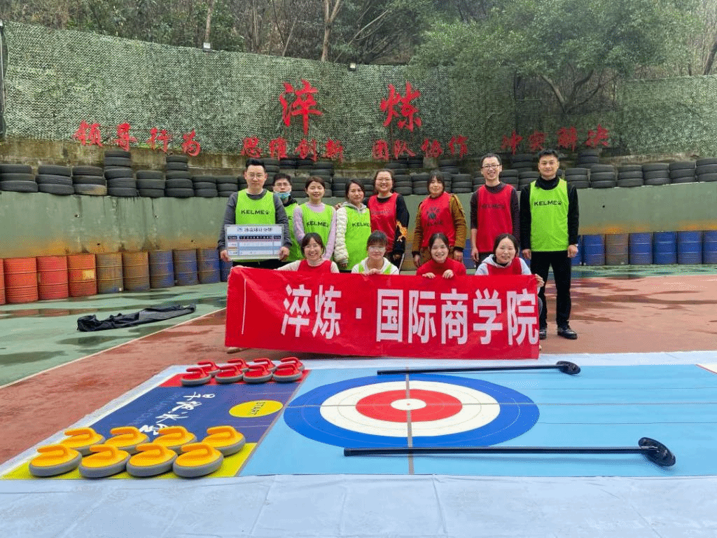 程教练就2022级新生参加“淬炼”领导力课程的情况,向工商管理教研室的老师们作出介绍,并对目前营地的项目设计与新商科的融科和老师们实地参观进行交流探讨。为了让老师们对营地更加深入的了解,工商管理教研室的老师们体验了“淬炼”领导力课程的特色项目:旱地冰壶。