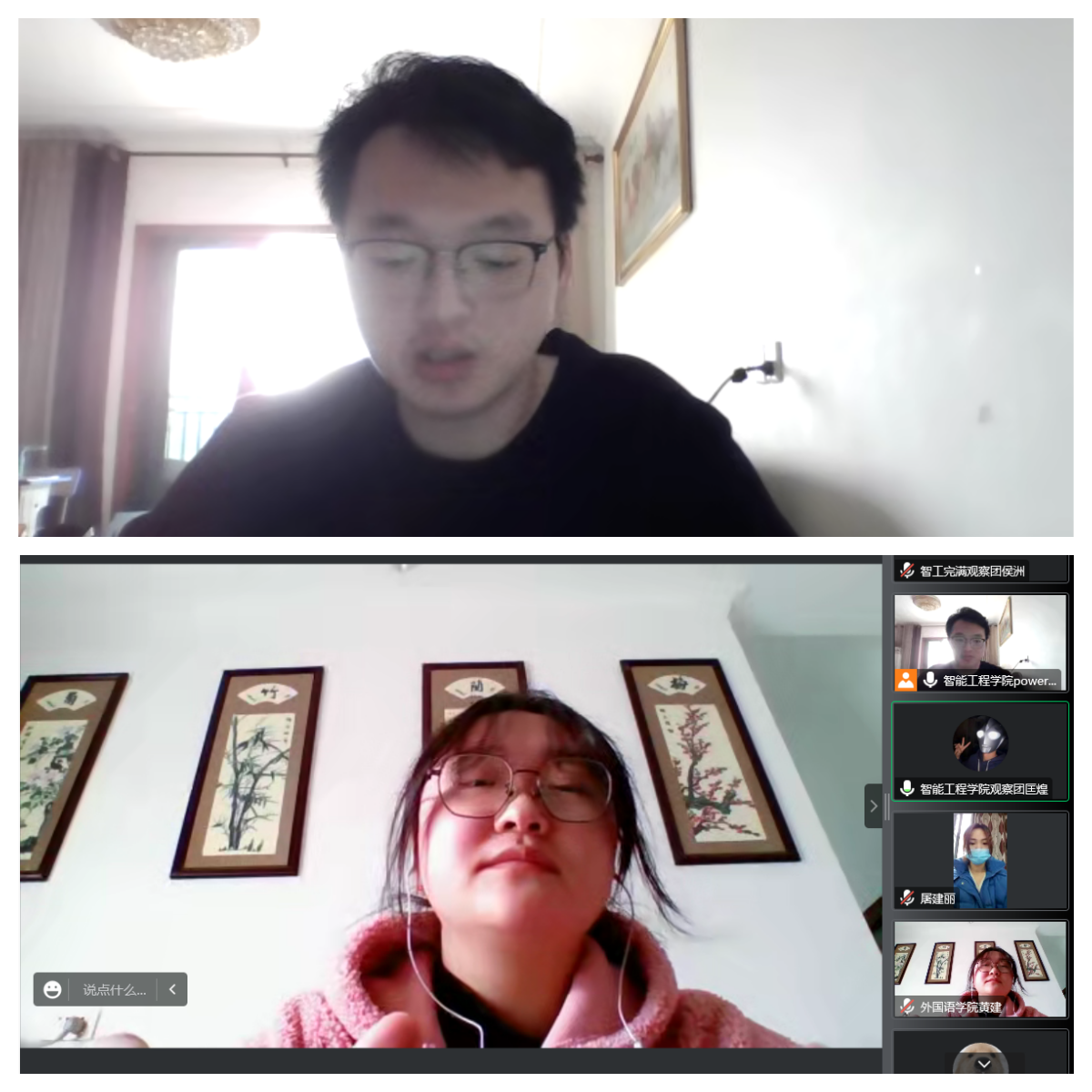 智能工程学院Power完满观察团小组长徐定懿同学就参与团队以来的各种问题及工作安排措施进行发言。他强调在小组分工安排上,致力于每位同学尽可能接触不同工作,才能够挖掘出自身的兴趣爱好。外国语学院Starlight完满观察团代表左平同学认为最感动的是在观察团体会到小组成员齐心协力为方案出谋划策,为新闻稿贡献自己的一份力量。两位同学发言完毕后,进入了全体成员自由交流环节。在此环节各位成员发言踊跃,在一问一答地交流中畅想接下来的团队规划,氛围轻松活泼。