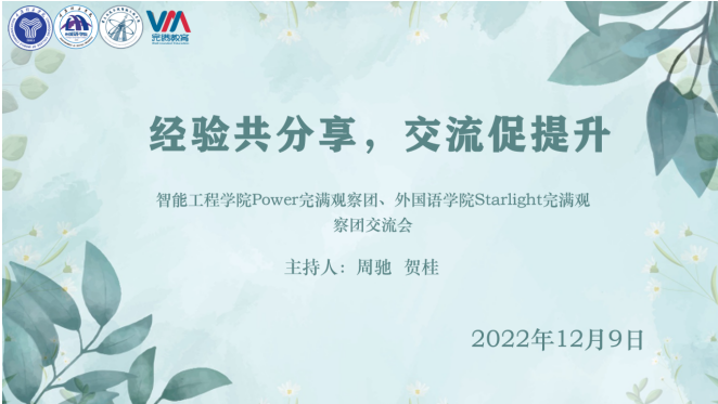 为增进两院之间完满观察团成员合作交流,更好发挥完满教育活动“温度计”的职能, 12月9日中午12点智能工程学院与外国语学院联合举办了完满观察团交流会。秉持“完满因交流而多彩,完满因互鉴而丰富”理念,会议邀请到智能工程学院Power完满观察团指导老师谭英姿老师、外国语学院Starlight完满观察团指导老师屠建丽老师,以及两院完满观察团全体成员。