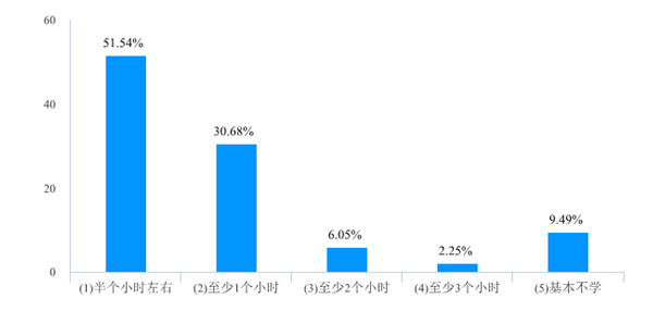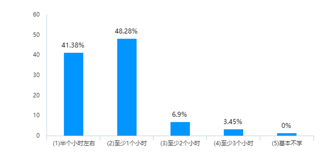 根据学生自己对于课下学习通识课程的时间统计来看,学生课下学习通识课程的时间51.54%的学生是半个小时左右。而教师根据自己课程课下布置作业或阅读的任务,预测学生至少需要一个小时左右。课下时间的安排缺乏影响学生学习和阅读的效果。