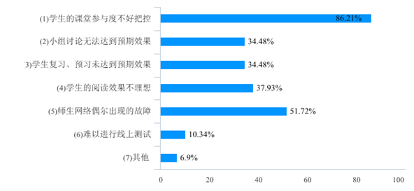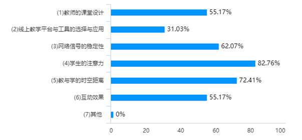 (2)教师对于线上教学存在的困难和疑惑最主要的是学生的课堂参与度不好把控,因为无法面对面,不了解学生的掌握情况和实际水平等。其次就是网络出现的故障影响教学效果。