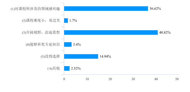 首先,学生对于目前线上通识课程有更深入的认识,特别是对于选修课的态度,更多的学生选课的原因集中在课程所涉及的领域感兴趣和可以开阔视野启迪思想两个方面。